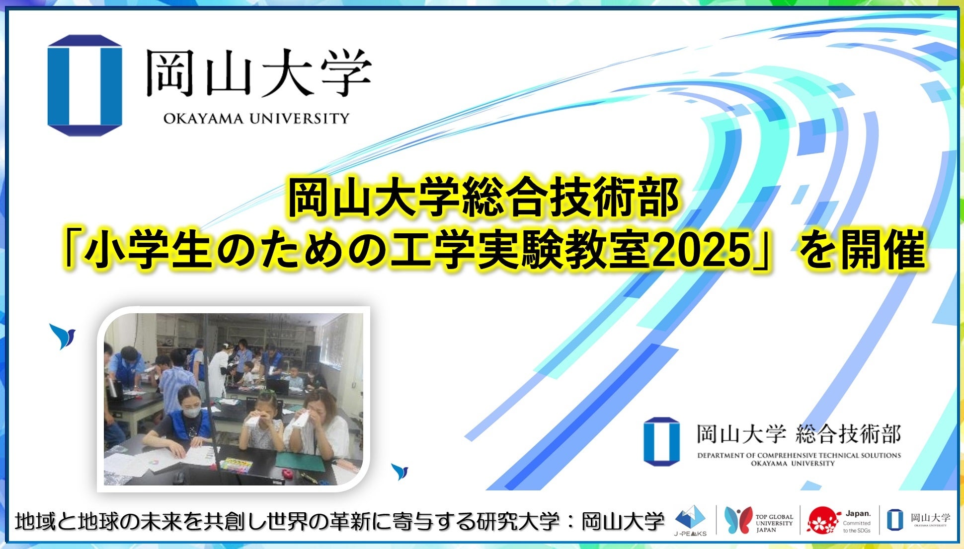 国立大学法人岡山大学(本部:岡山市北区、学長:那須保友)の技術統括監理本部を構成するひとつである総合技術部は、2025年8月7日に小学4~6年生を対象とした「小学生のための工学実験教室2025」を本学津島キャンパスで開催し、3つのテーマにそれぞれ10人ずつ小学生とその家族が参加しました。
