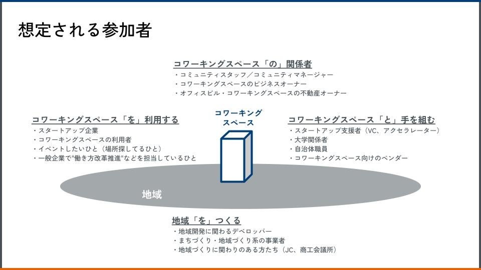 我々はたくさんの人にコワーキングスペースを利用いただきたいです。そしてご利用いただいた際に体感いただく付加価値の一つとして、利用者の課題が解決されるコミュニティを構築することを目指します。同時に我々の経済活動が地域にとってポジティブな影響をもたらす、そんな互恵的関係を参加者皆様と一緒に考えるカンファレンスにいたします。
