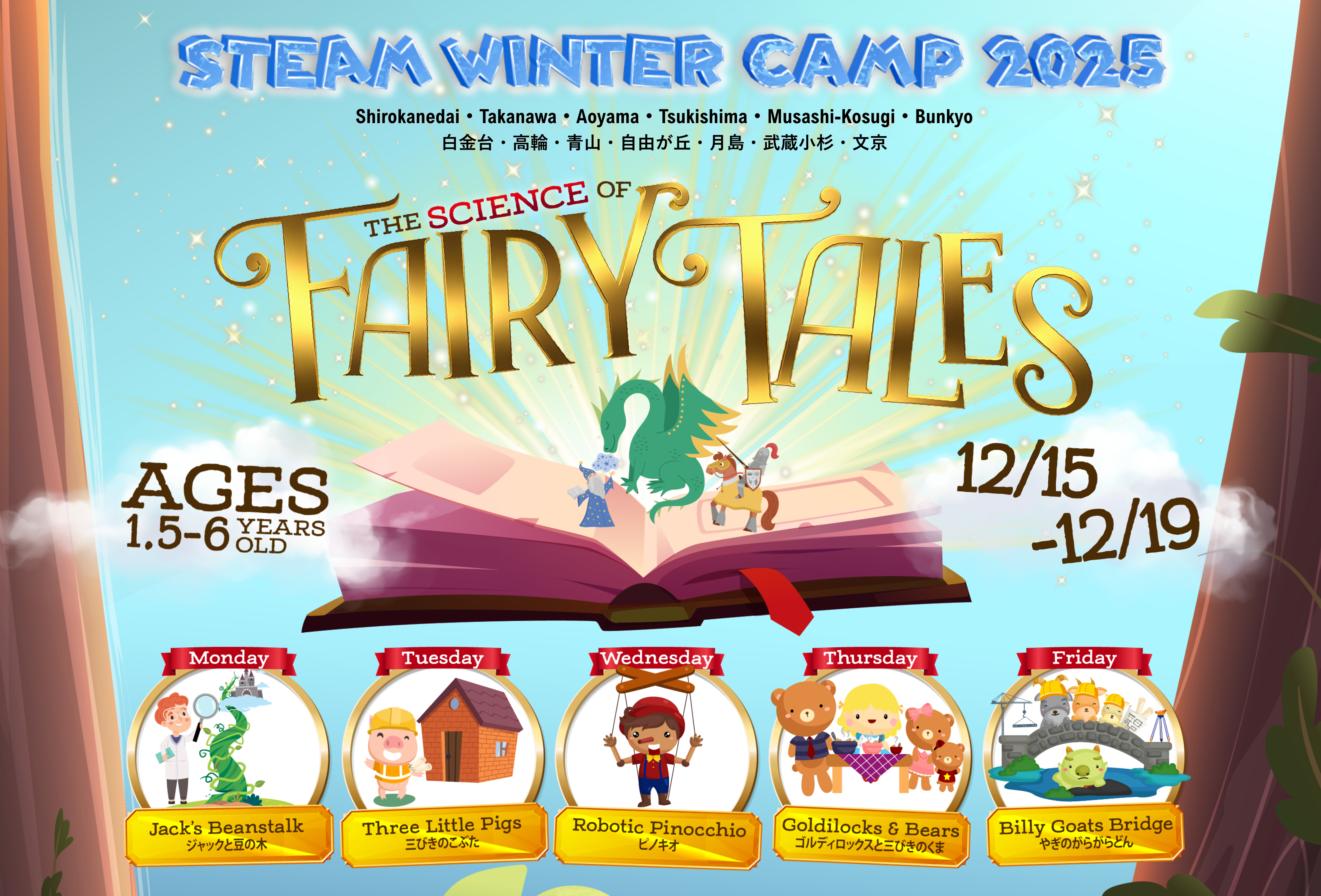今年のテーマは「The Science of Fairy Tales」です。月曜日から金曜日まで、毎日異なるおとぎ話をテーマに、英語でSTEAMアクティビティを体験します。