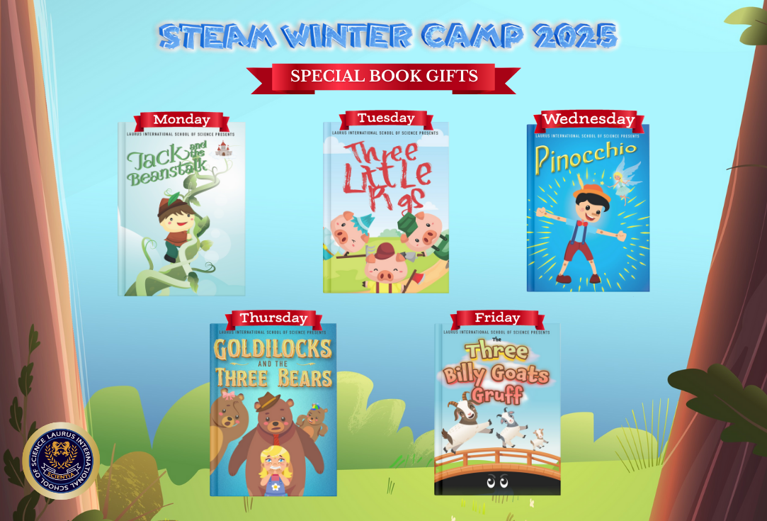5日間すべてに参加したお子さまには、Winter Camp 2025 でテーマとなったおとぎ話の絵本を計5冊プレゼントいたします。ローラスが特別に制作した絵本をおうちで楽しめます。