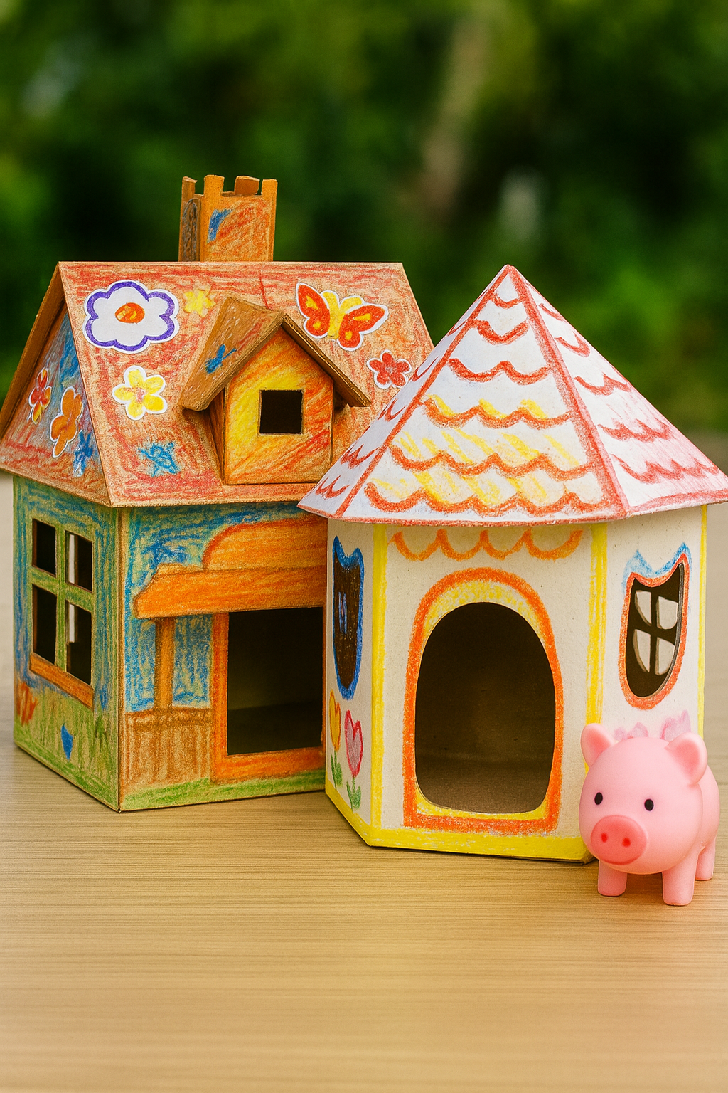 三びきのこぶたのお話から、こわれやすいお家と丈夫なお家の違いを考えながら、家づくりの工夫を学びます。