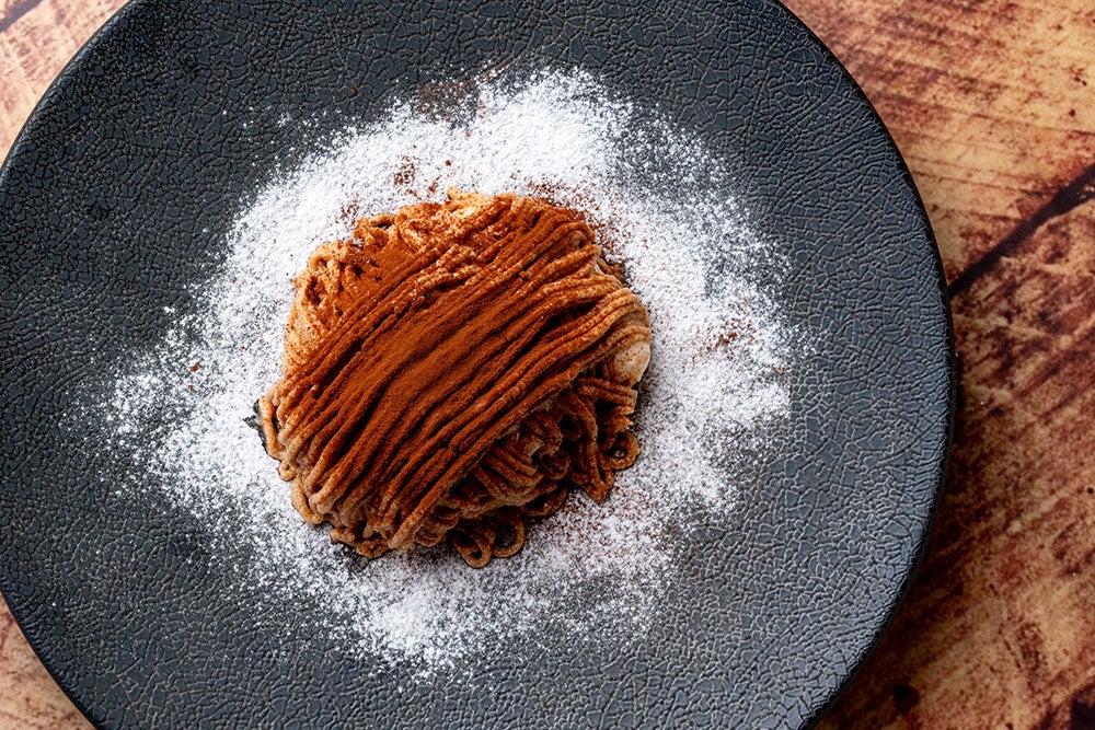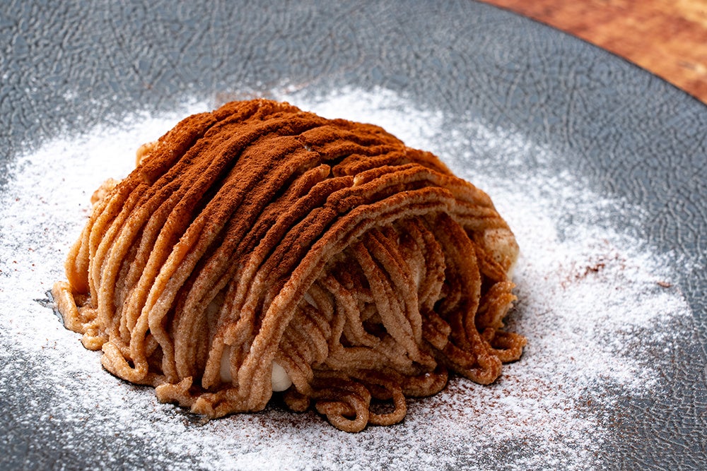 厳選された北海道産マスカルポーネチーズと生クリーム、ラム酒を使用し、店内でひとつひとつ丁寧に仕込む大人の自家製ティラミスに秋の味覚・栗のクリームを重ね、モンブラン仕立てに仕上げました。