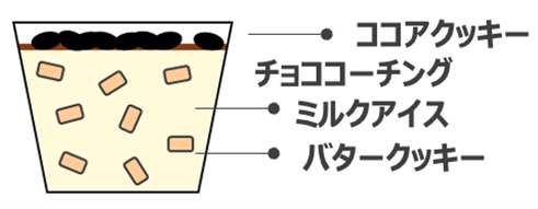 天面のココアクッキーとミルクアイスの間にチョコレートコーティングを敷いているのがザクザク食感を生み出すポイントです。天面のクッキーがアイスの水分などを吸わないようにする仕様にしています。