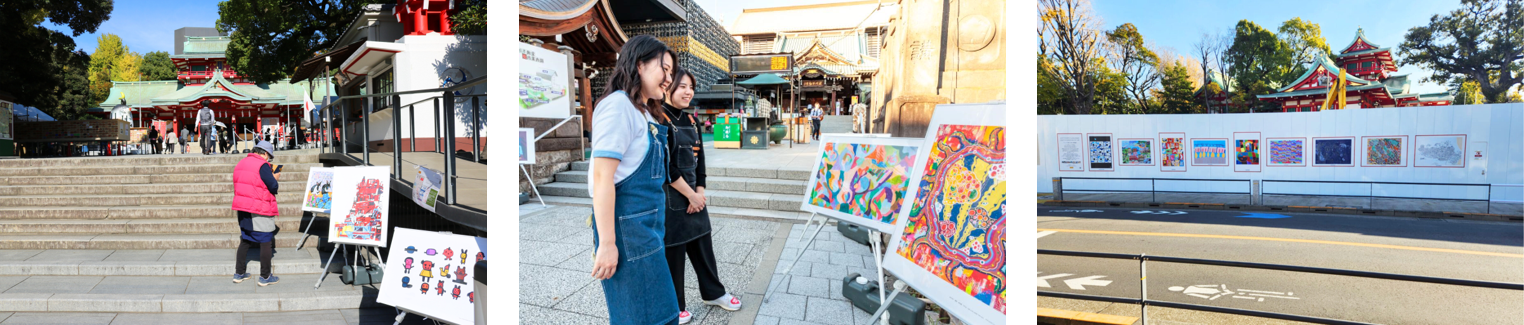 富岡八幡宮や深川不動堂など歴史ある場所を中心に、老舗商店の軒先などに作品を展示。まちの記憶とアートが響き合う空間が広がります。