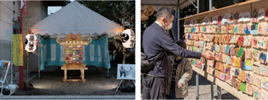 江東区内の障がいのある子どもたちや福祉施設に通う方たちに、それぞれの想いを込めて自由に描いてもらった1,300枚以上のアート絵馬が、富岡八幡宮に飾られます。色とりどりの絵馬が飾りつけられた絵馬ボードの中心には「みんなのアート絵馬神輿」が展示されています。アートパラ深川おしゃべりな芸術祭のシンボルになっている「小さな芸術家たち」が描いたアート絵馬です。