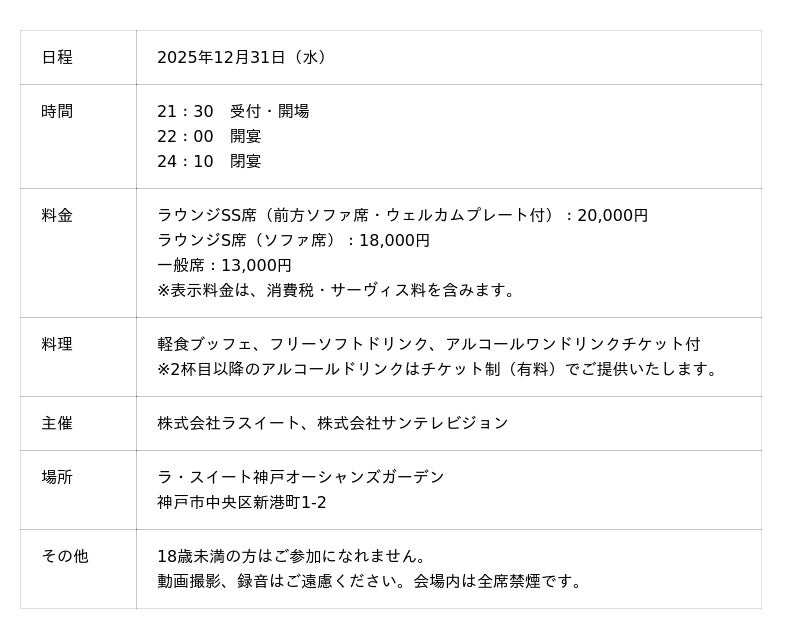 ラ・スイート神戸オーシャンズガーデン(総支配人:横山 秀樹 所在地:神戸市中央区)は、12月31日に大好評イベントの年末特別企画「サンテレビボック酒席 vol.3 ~みんなで優勝祝賀会~」を開催いたします。