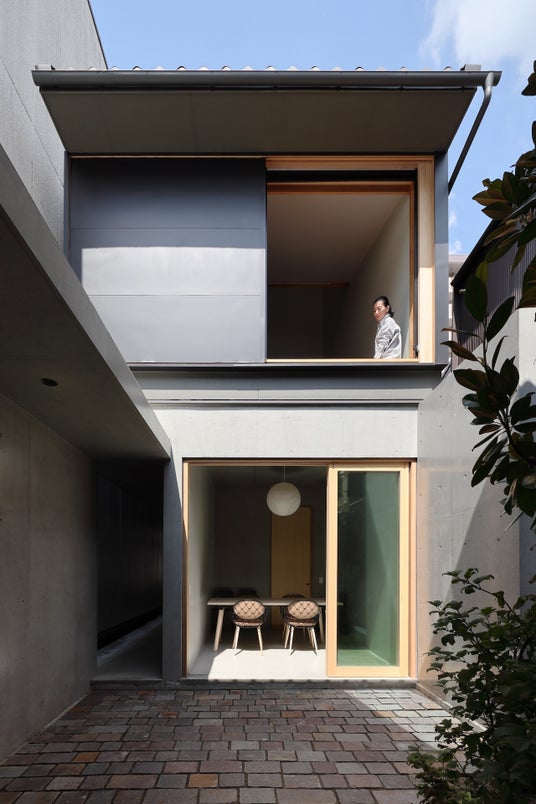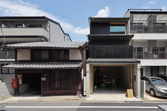 西陣の歴史ある町並みに新築された職住一体型町家は、地域に根ざした現代的な職住のあり方を実現している。1階をカフェ、奥に設計事務所、上階に住居を配し、商いと暮らしを融合させる構成は、町に開かれた拠点として若い世代の交流や地域活性化につながっている。外観は無理に伝統を模すのではなく、軒や屋根勾配などの要素を自然に整えることで、京町家の景観と調和を図っている点が特徴的である。働く・住む・集うを一体化し、町の賑わいを再生するこの試みは、現代の町家像として高く評価できる。
