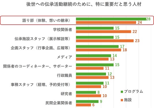 - 「後世への伝承活動継続のために特に重要な人材」の最多回答は「語り部(体験、思いの継承)」で、「来訪者の意識や行動を変えるのに東日本大震災の語り部は寄与するか」に対して、伝承団体・施設の100%が「寄与する」と、団体・施設の両者から語り部への高い評価
