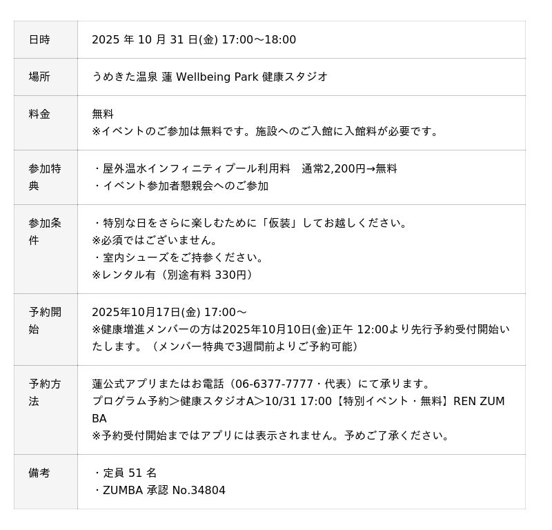 「うめきた温泉 蓮 Wellbeing Park」(総支配人:藤立 達哉、所在地:大阪市)は10月31日に同施設で人気レッスンであるZUMBA(ズンバ)の特別イベント「REN ZUMBA vol.5 林 和美 × 岡本 拡子~ハロウィン スペシャル~」を開催することをお知らせします。