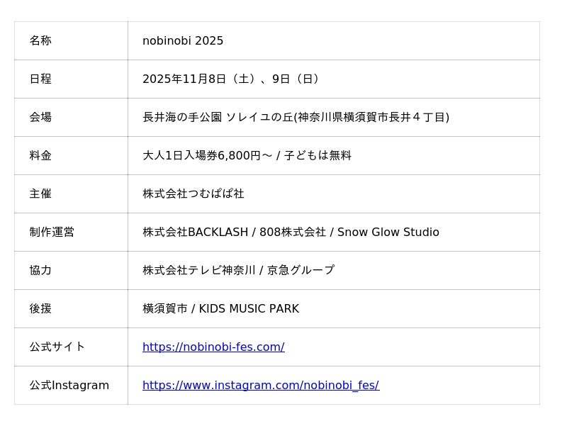 「nobinobi 2025」は、子育て世代を中心にSNS約180万フォロワーを持つ「つむぱぱ社」が主催。神奈川県横須賀市にあり、東京ドーム約6個分の敷地面積をほこる『長井海の手公園 ソレイユの丘』にて2025年11月8日(土)・9日(日)に初開催いたします。親子で楽しめるイベントステージやワークショップ、アトラクションやマーケットなど、秋のおでかけにもぴったりな「家族みんなの、年にいちどの祭典」です。