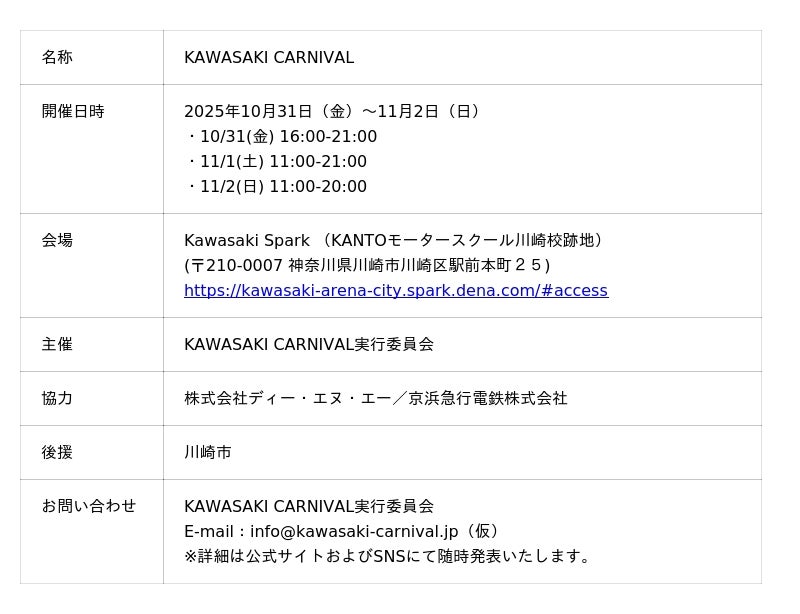 KAWASAKI CARNIVAL実行委員会(株式会社Color Create・西尾レントオール株式会社・FoodFes株式会社・株式会社with Create..〈順不同〉)は株式会社ディー・エヌ・エーおよび京浜急行電鉄株式会社の協力のもと、「Kawasaki Spark」のフィナーレを飾るスペシャルイベント、**『KAWASAKI CARNIVAL』**を開催いたします。
