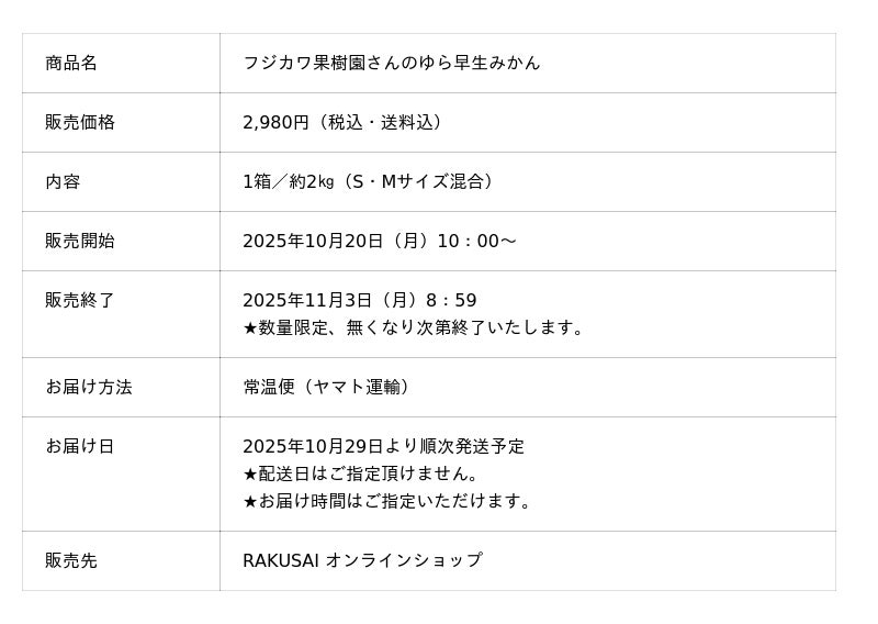 楽彩株式会社(本社:東京都足立区/代表取締役社長:大崎善保)は、今年は当たり年と言われるみかんの中から、香川県産ゆら早生みかんを厳選し、2025年10月20日(月)10:00より公式オンラインショップにて500箱限定で販売開始いたします。