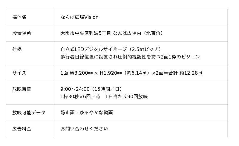 株式会社Cyujo(本社:大阪市中央区、代表取締役:清水良浩)が管理運営する、大阪・ミナミの新たな情報発信メディア「なんば広場Vision」は2025年10月20日(月)に稼働を開始しました。