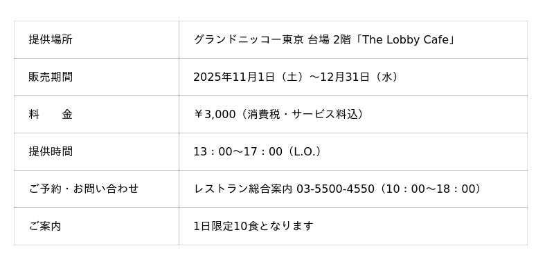 「東京を楽しむ 東京をくつろぐ」ひとときをお届けするグランドニッコー東京 台場(住所:東京都港区 総支配人:塚田 忠保)は、吹き抜けのロビーフロアに心地よい光が降り注ぐ「The Lobby Cafe」にて、国産いちごの色彩と香りが引き立つ「ホワイトストロベリーパフェ」を2025年11月1日(土)~12月31日(水)の期間で提供いたします。