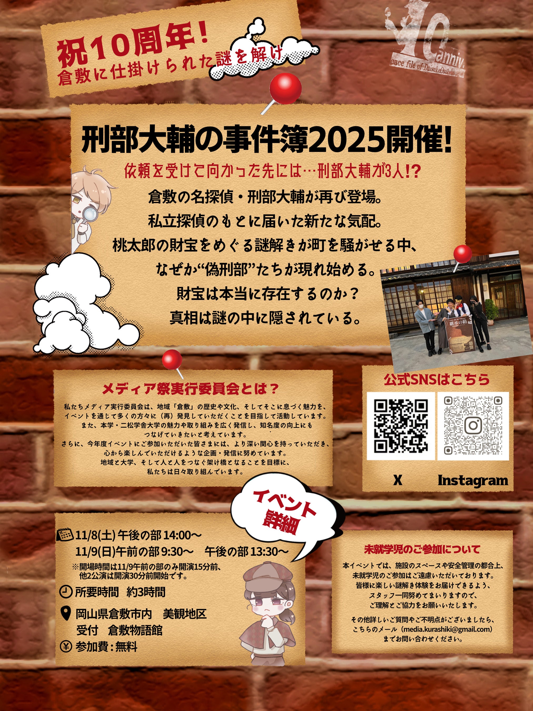 二松学舎大学メディア祭実行委員会主催の「名探偵刑部大輔の事件簿」は、参加者が物語の登場人物となり、未解決事件の真相を解き明かす体感型推理ゲームです。令和7年11月8日(土)と9日(日)に倉敷美観地区で開催され、倉敷美観地区内に隠された証言や証拠品を基に推理を進める新感覚のゲームです。物語世界と現場を行き来しながら真相に迫るこのイベントは、ミステリー作品への興味を深めてくれる絶好の機会です。推理好きの方はお見逃しなく。