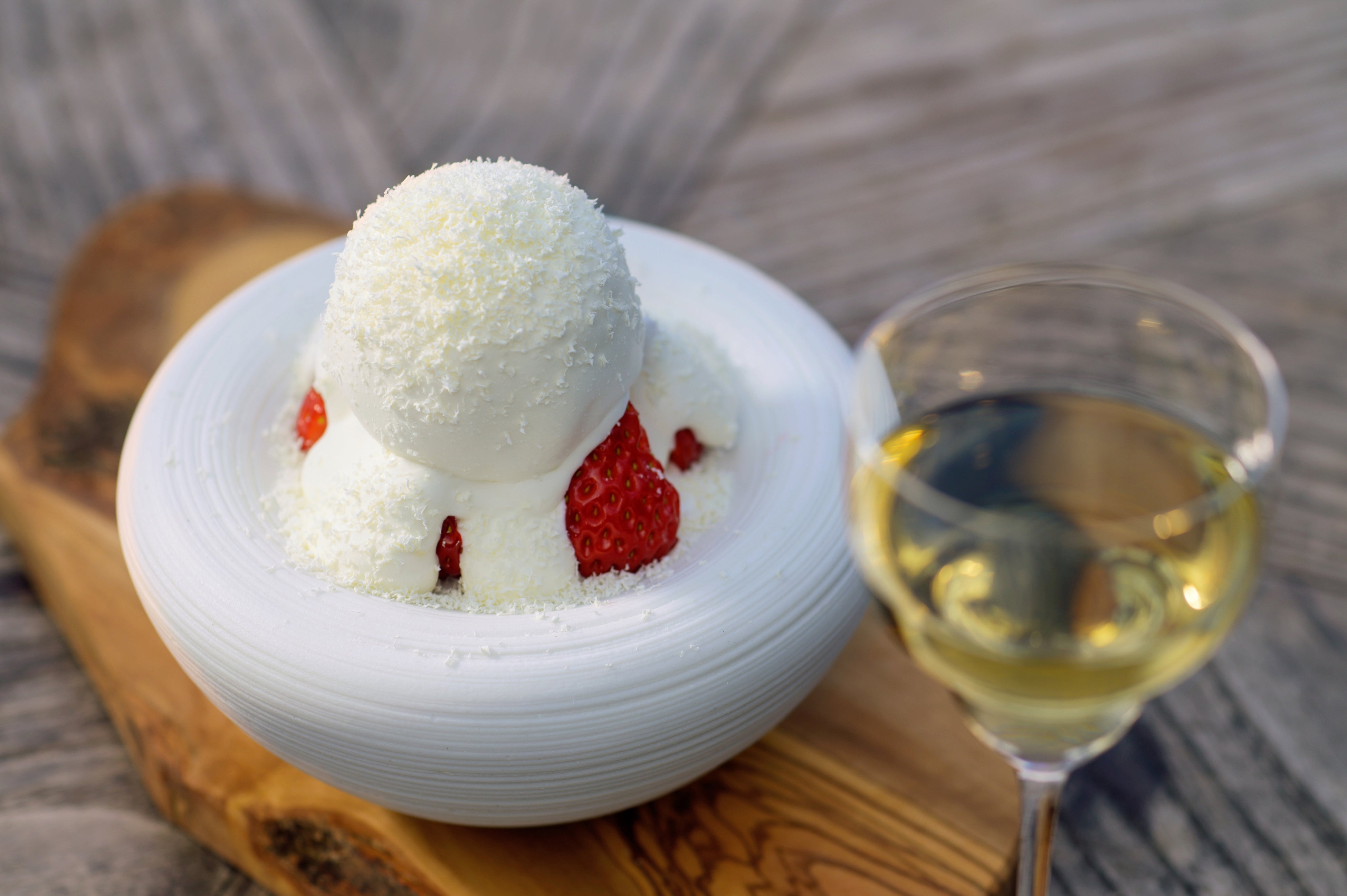 やわらかな甘みと酸が苺と調和し、クリームのミルキーな風味を引き立てます。雪景色を眺めながら味わう食後の一杯としても心地よさを感じられるワインペアリングです。