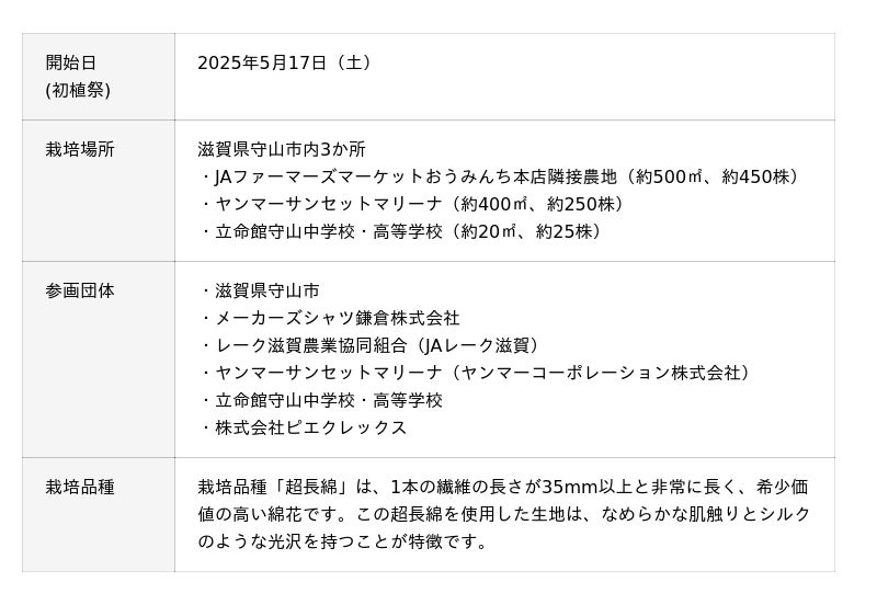 株式会社村田製作所の完全子会社である株式会社ピエクレックス(本社:滋賀県野洲市、代表取締役社長:玉倉大次)が推進するアパレルの循環インフラ「P-FACTS」(ピーファクツ)と、メーカーズシャツ鎌倉株式会社(本社:神奈川県鎌倉市、代表取締役社長:貞末奈名子)が掲げる「ALL MADE IN JAPAN」構想の連携によって展開している「鎌倉シャツコットンプロジェクト@守山」において、2025年10月16日(木)、滋賀県守山市内3か所の栽培地で初の収穫祭を開催しました。