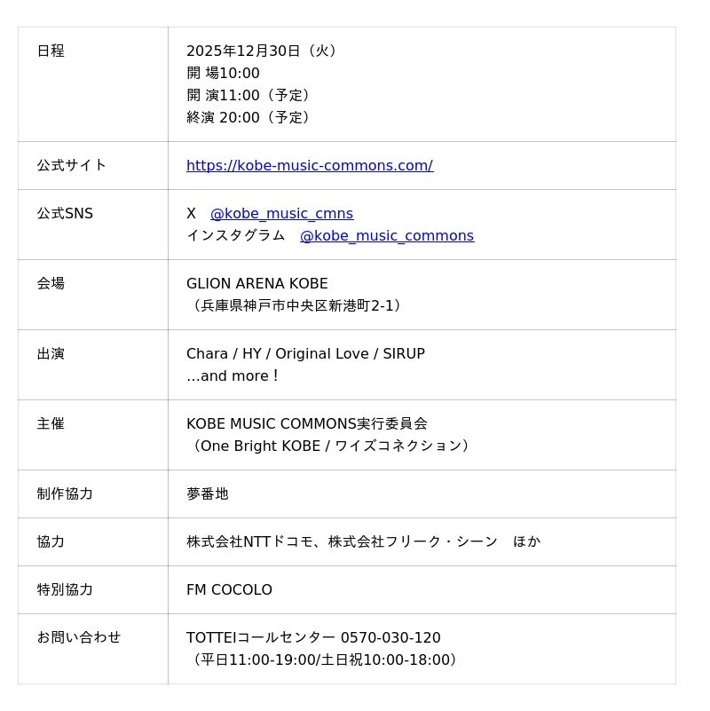 株式会社One Bright KOBE(住所:神戸市中央区、代表取締役社長 渋谷 順)は、GLION ARENA KOBUE初の年末音楽ライブイベント「KOBE MUSIC COMMONS 2025」を2025年12月30日(火)に開催。10月23日(木)正午12時よりチケットオフィシャル先行受付を開始します。