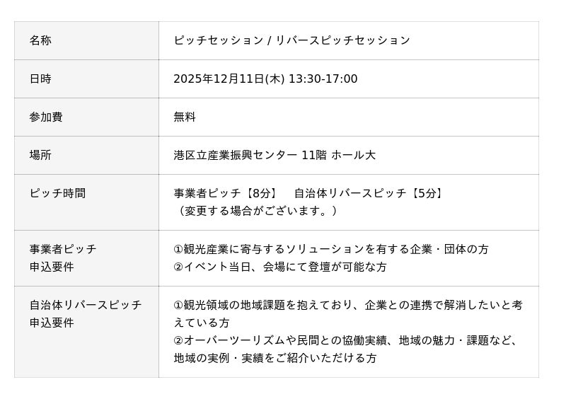港区立産業振興センター(港区芝5-36-4 札の辻スクエア内)主催「ALL JAPAN CONFERENCE -観光編-」は、イベント内で実施するピッチ・リバースピッチの登壇者募集を開始しました。