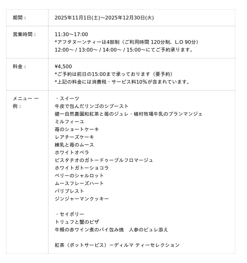さらに、蟹とトリュフを贅沢に使用したピザや、牛頬肉の赤ワイン煮パイ包みなど、食べ応えのあるセイボリーも充実。甘い香りと香ばしい風味が交錯する、冬ならではの至福の時間をお楽しみいただけます。
