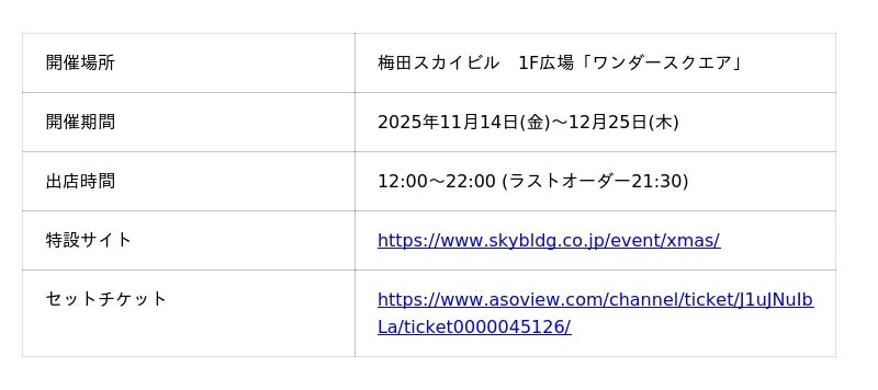 梅田スカイビルでは、2025年11月14日(金)から12月25日(木)の期間中、クリスマスマーケット「Wonder Christmas Marche」を開催します。
