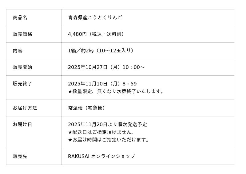 楽彩株式会社(本社:東京都足立区/代表取締役社長:大崎善保)は、生産量が極めて少なく、「知る人ぞ知る希少品種」として再注目されている『こうとくりんご』を、2025年10月27日(月)10:00より、公式オンラインショップにて300箱限定で販売開始いたします。