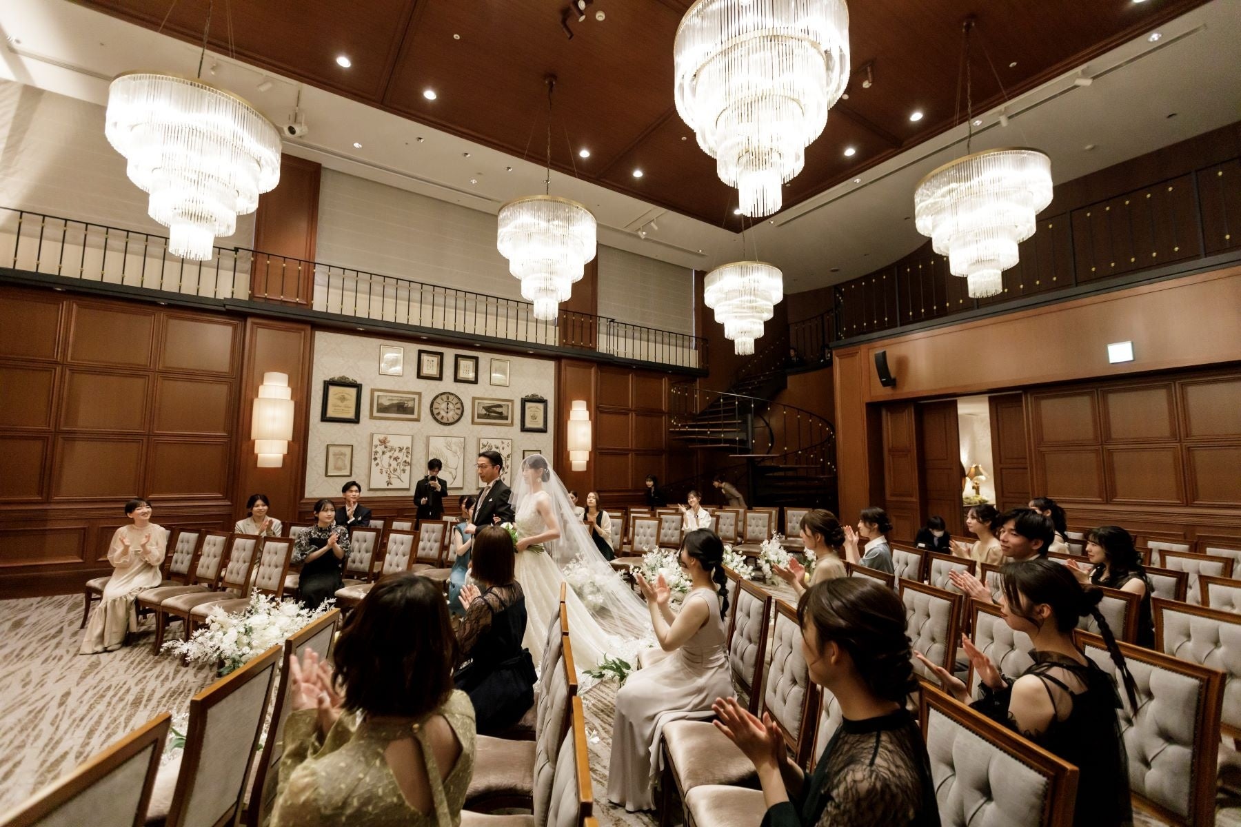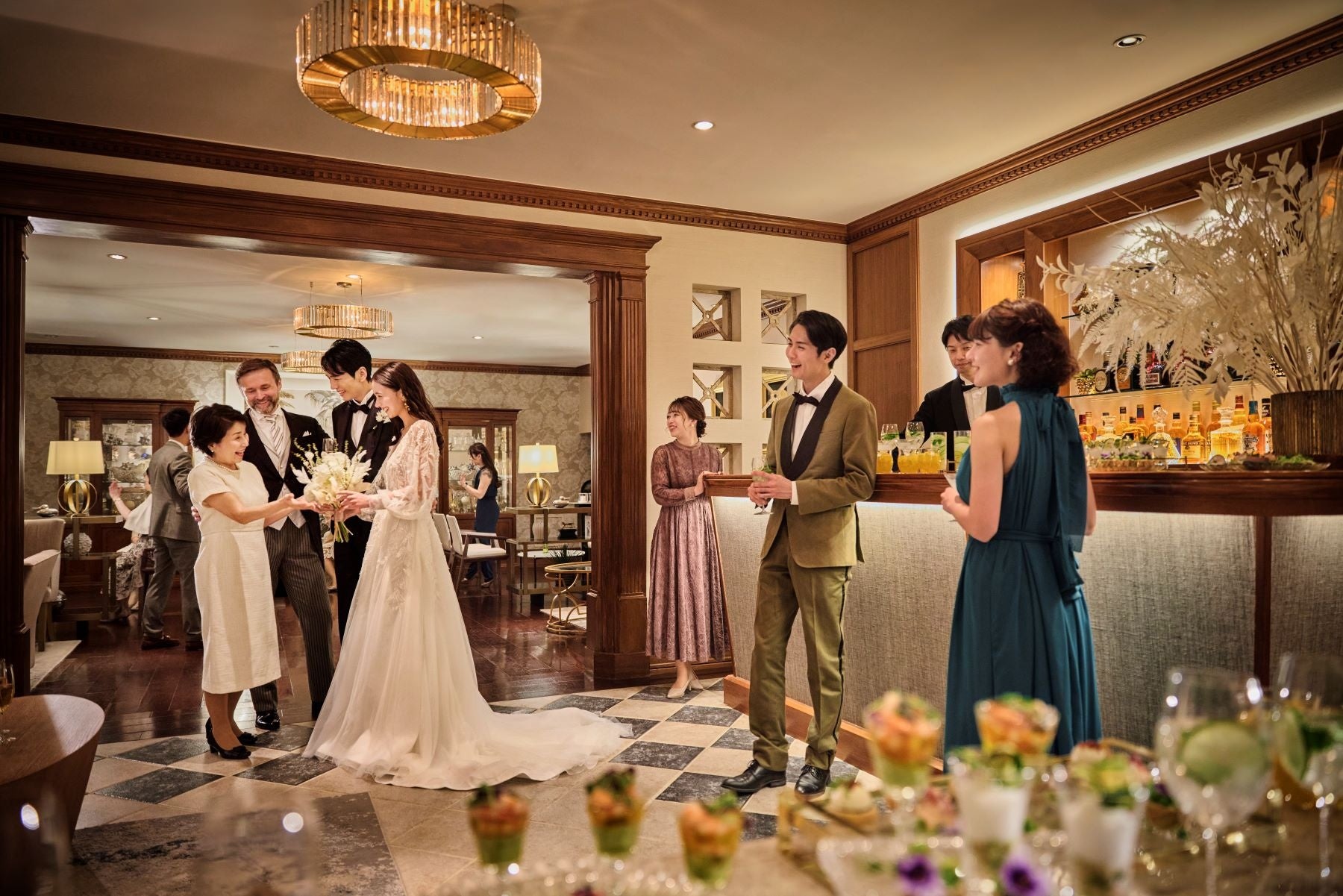 お招きした大切なゲストを「The Library」へご案内。ウエディングドレスも映えるモダンな雰囲気でこだわりのシャンデリアや調度品が飾られ、おふたりの入場を心待ちに。