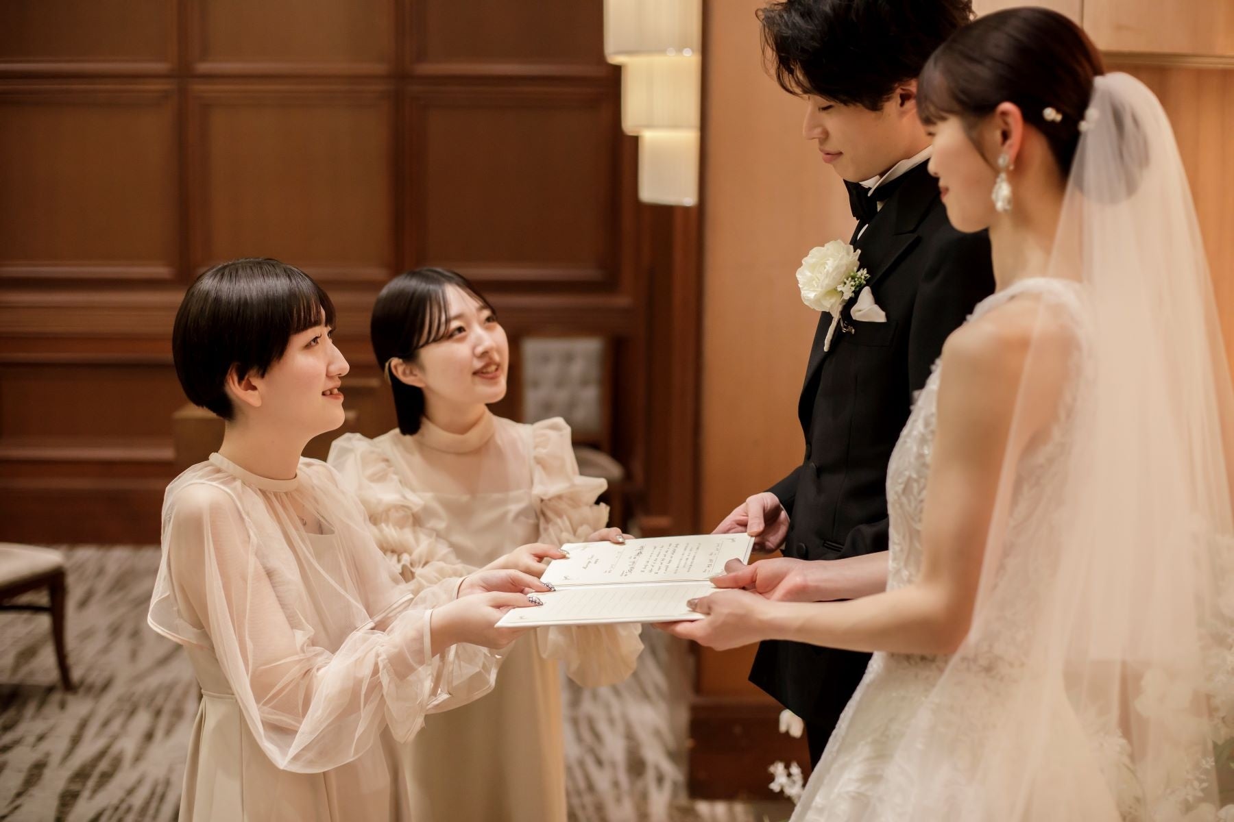 おふたり、親御様、そしておふたりの大切なゲストにも参加いただき「The Library」オリジナルの結婚証明書に署名。結婚式後は、毎年記念日にお互いへメッセージを書いたり、家族写真を貼って保管できたりと、一生涯カタチとして残る本(アルバム)に。