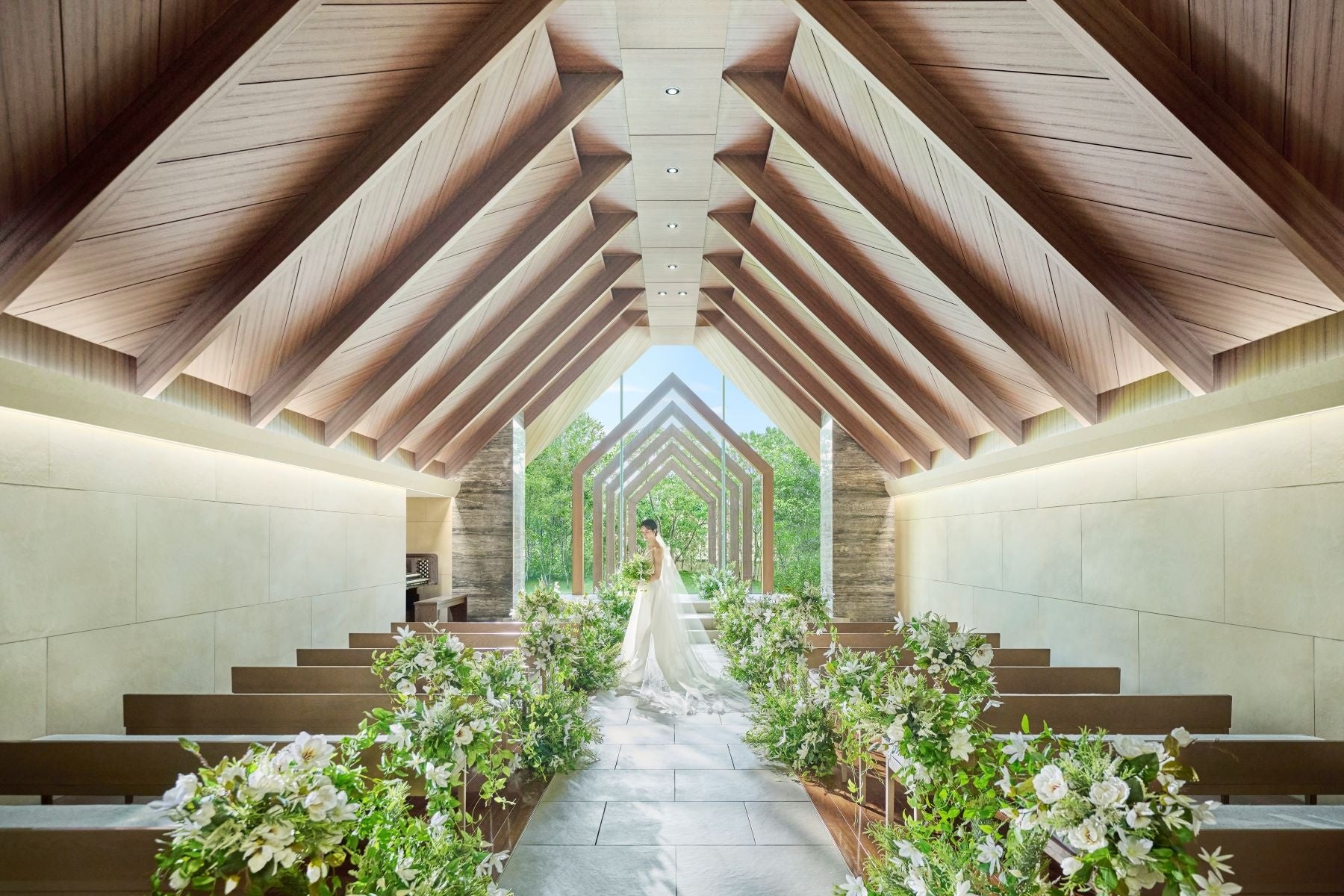 祭壇の奥に広がる空とガーデン。天然石や木のぬくもりが印象的な、建築美が、魅力のチャペル。