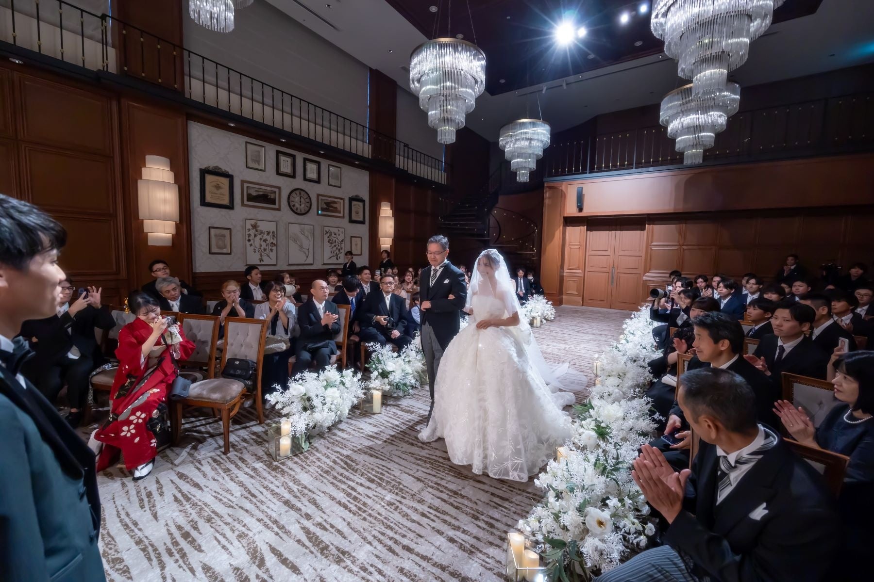 入場方法も自由に。親御様やおふたりご一緒の入場も。おふたりや親御様が好きなBGMを流しながら、今までにない入場も可能。
