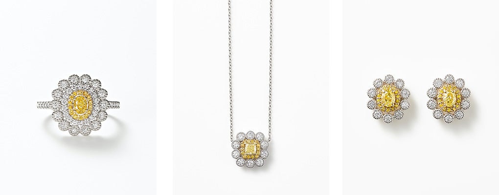 ブランド名を冠した最初のデザインとして、中央にイエローダイヤモンドを配したフラワーモチーフのジュエリー<NARIN>が誕生しました。