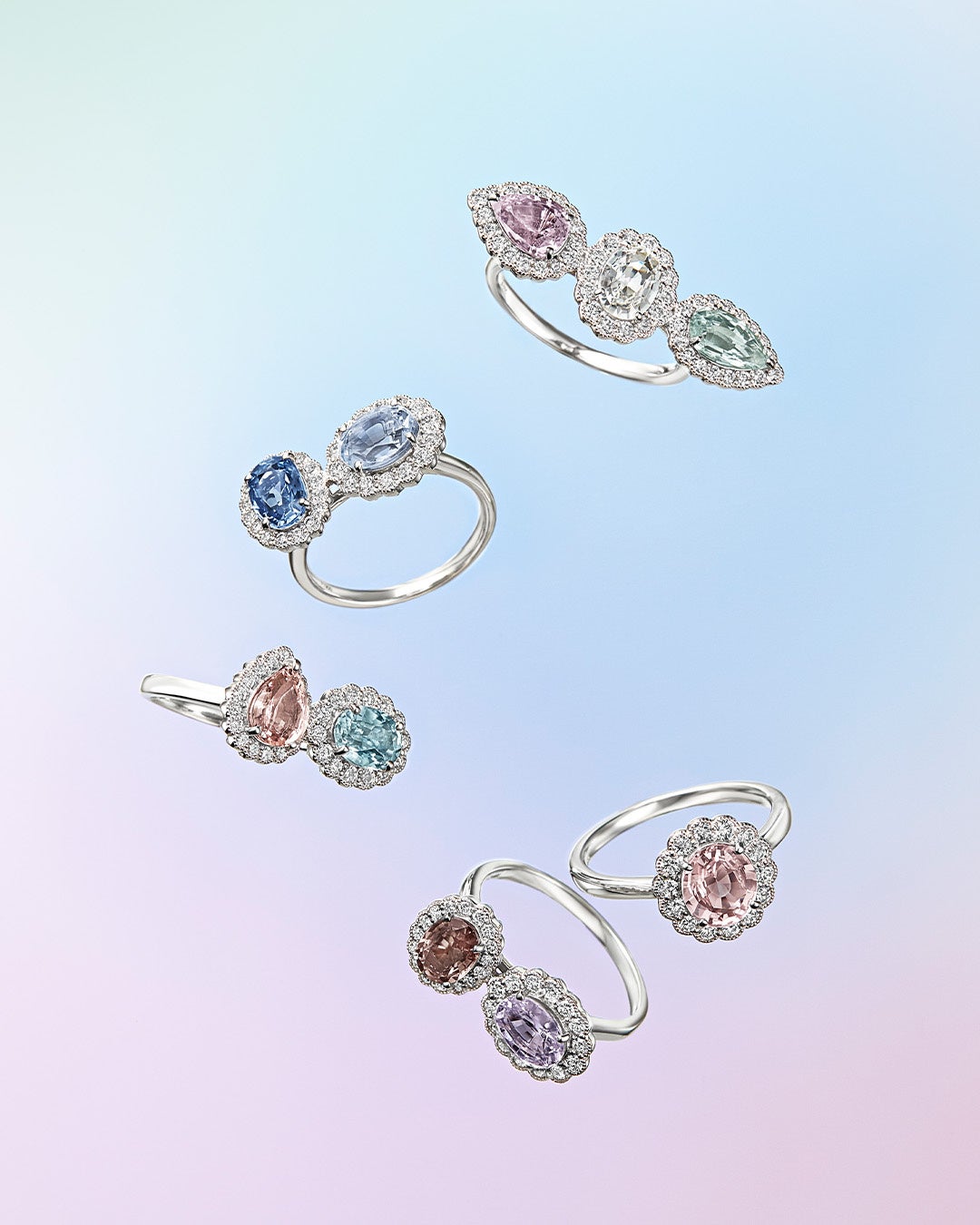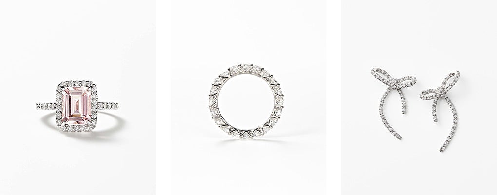 左:撫子色に輝く大きなモルガナイトを、シャープなエメラルドカットを施すことで、フェミニンでありながら甘すぎない麗しい大人の女性らしさを演出する”MILKY PINK” リング ¥599,500(税込)