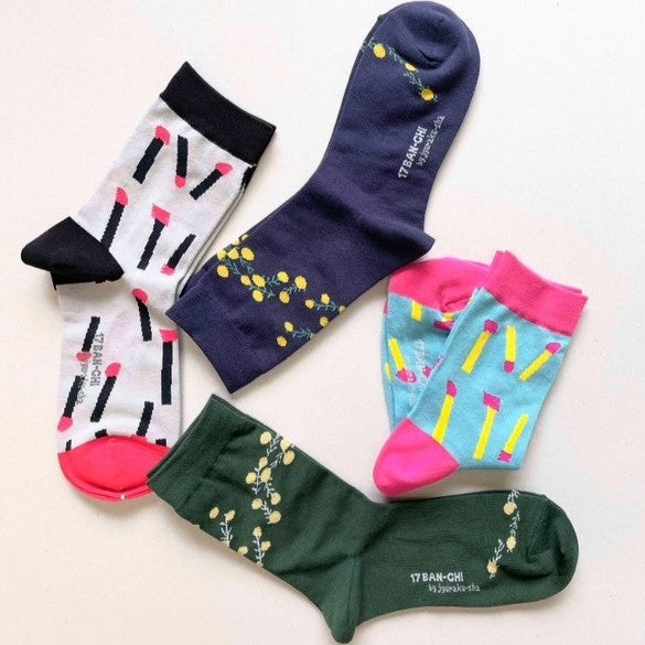 【17BAN-CHI】『なつかしくてあたらしいデザイン』をテーマに国内の工場でオリジナルデザインの靴下を制作。会期中は人気の「マッチ棒柄」をはじめ、10種類以上のくつしたをご用意。新柄「ミモザ柄」も登場するかも。