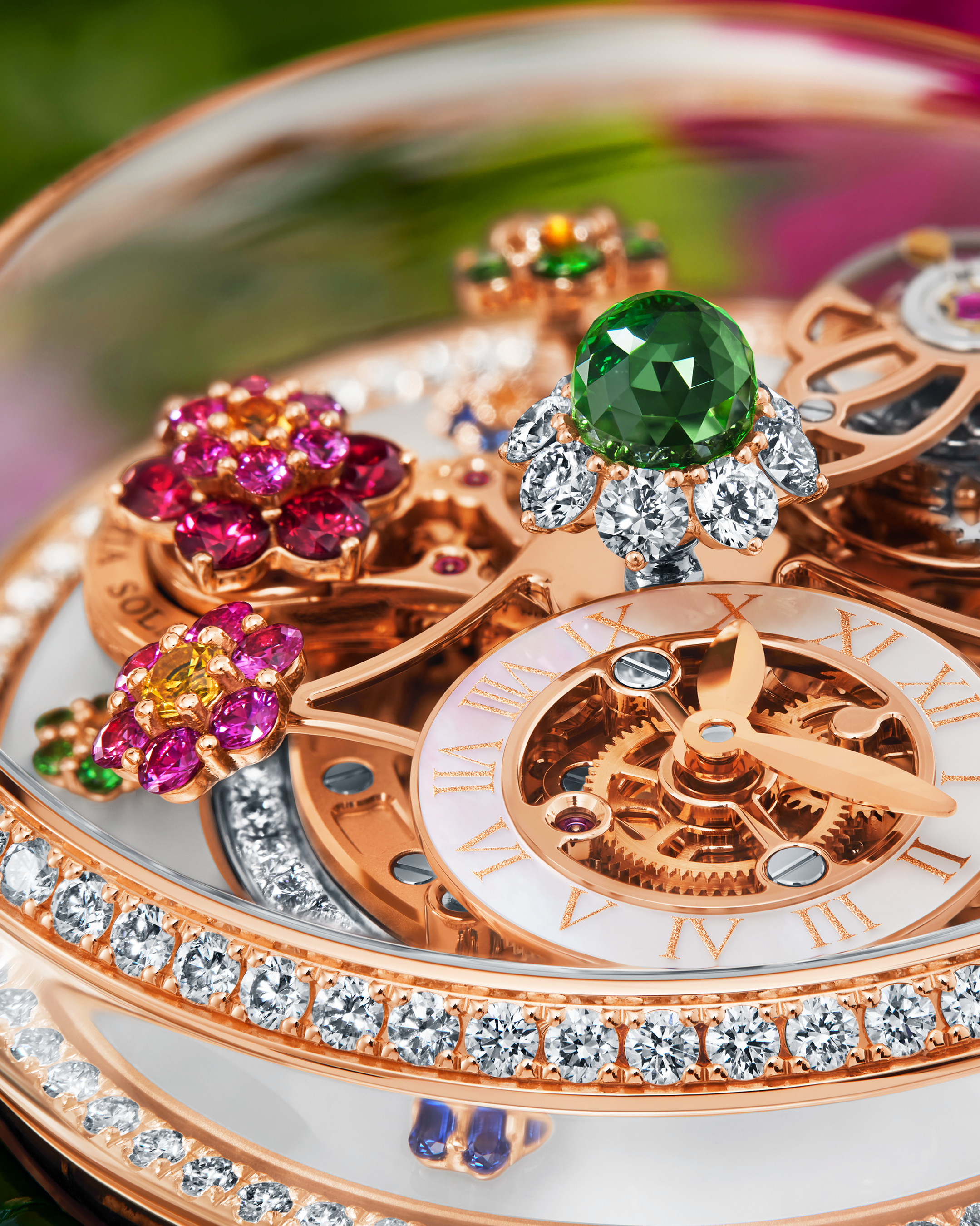 サファイアクリスタルドームの内部では、蝶をかたどったフライングトゥールビヨンが羽ばたくように回転し、その周囲を宝石の花々が10分で一周するプラットフォーム上でゆるやかに咲き誇ります。香り立つような彩色と立体的な造形が、生命の循環――すなわち時間の連続性――を象徴し、視覚・感情・時間が一体化した“静謐な回転庭園”を生み出しています。