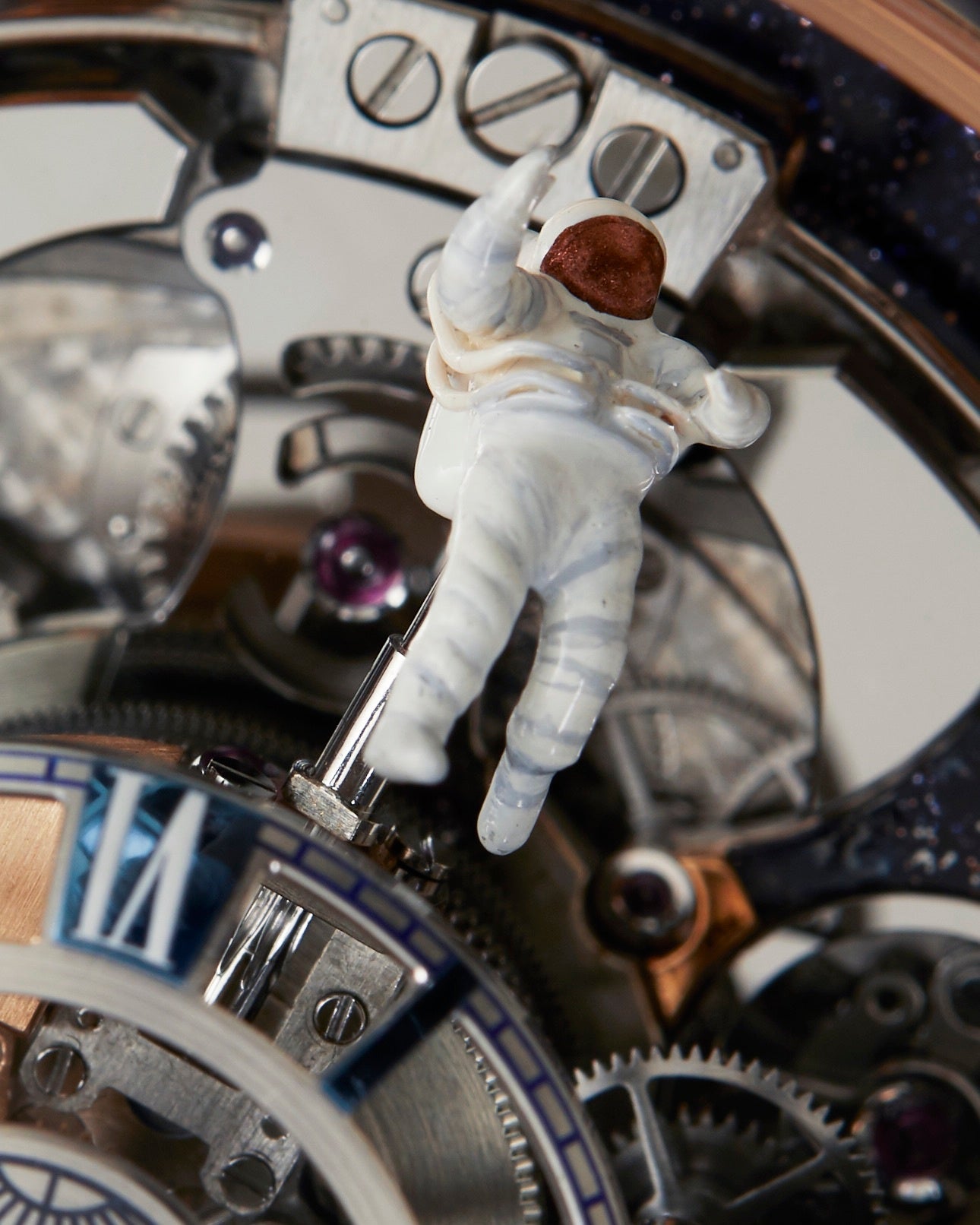 中央の垂直軸を中心に、地球、ダイヤモンドを模した“月”、オフセンターの時刻表示、そして多軸トゥールビヨンを搭載した4本のアームが、それぞれ自転しながら全体で公転を続けます。その下層に配置されたルーレットは、プッシュ操作によってオンデマンドで回転し、時計の中にエンターテインメント性を生み出しています。