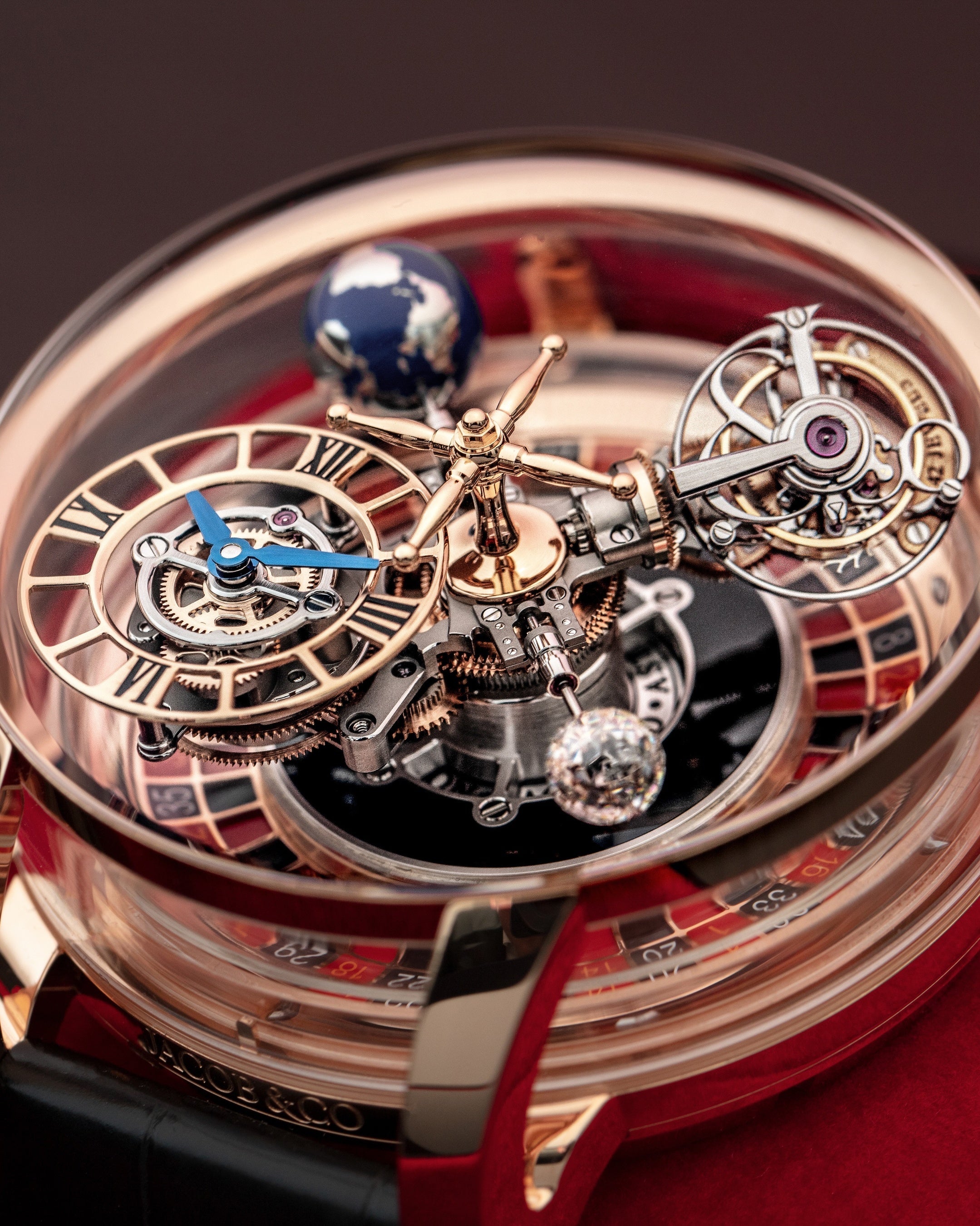 ルーレット上部では、アストロノミアの代表する4つの立体造形【ダイヤル、トゥールビヨン、地球、288面のダイヤモンド】が静かに回転し時間を魅せる