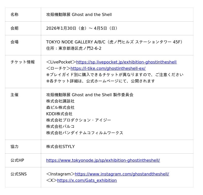 攻殻機動隊展 Ghost and the Shell 製作委員会(株式会社講談社、森ビル株式会社、KDDI株式会社、株式会社プロダクション・アイジー、株式会社パルコ、株式会社バンダイナムコフィルムワークス)は、2026年1月30日(金)から4月5日(日)まで、虎ノ門ヒルズの情報発信拠点「TOKYO NODE(東京ノード)」にて開催する『攻殻機動隊展 Ghost and the Shell』の入場チケットを2025年10月28日(火)10時00分より販売開始いたします。