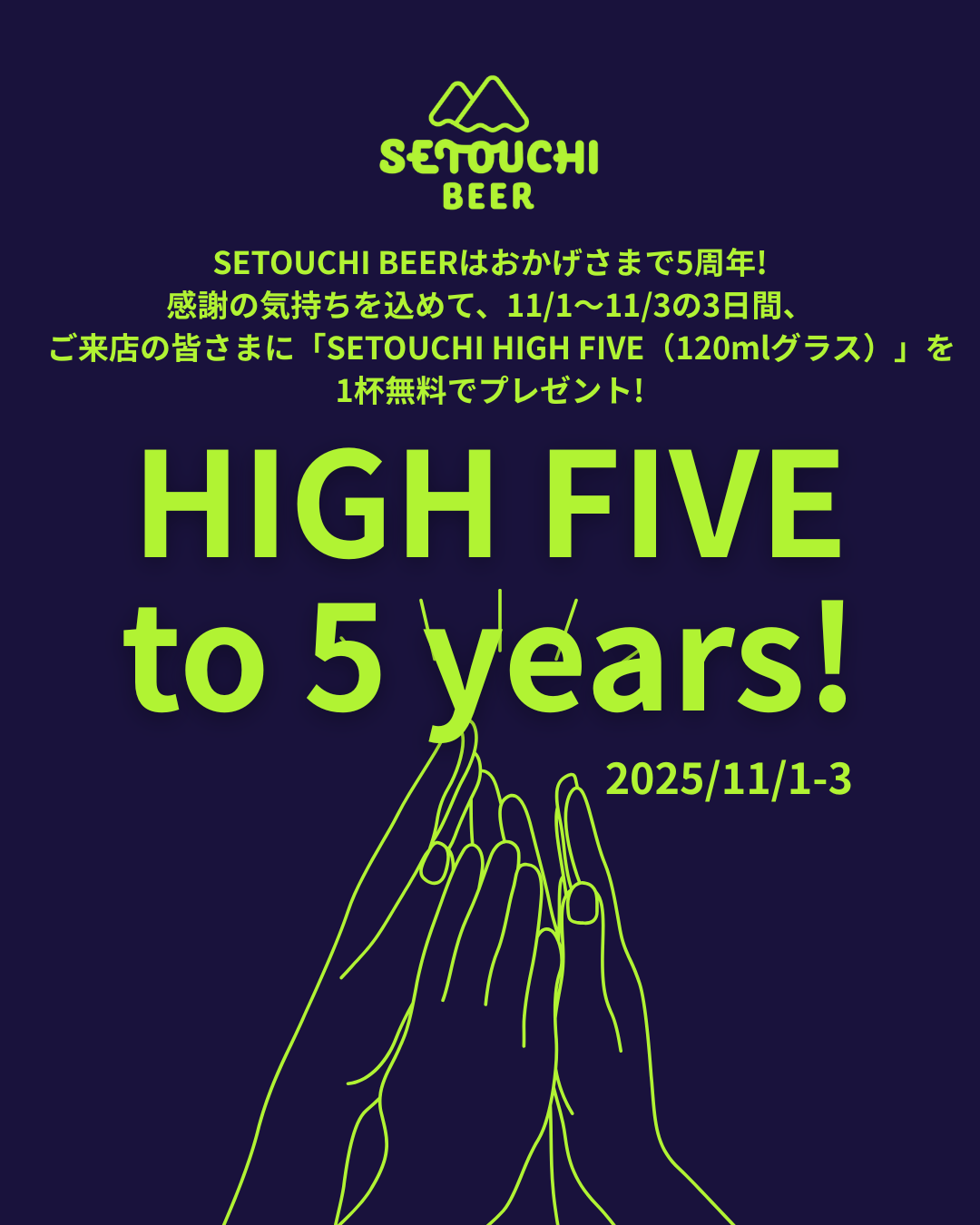 株式会社瀬戸内(本社:香川県高松市松島町、代表:田嶋真吾)は、「SETOUCHI BEER」設立5周年を記念した特別醸造ビール〈SETOUCHI HIGH FIVE IPA〉を発売いたします。
