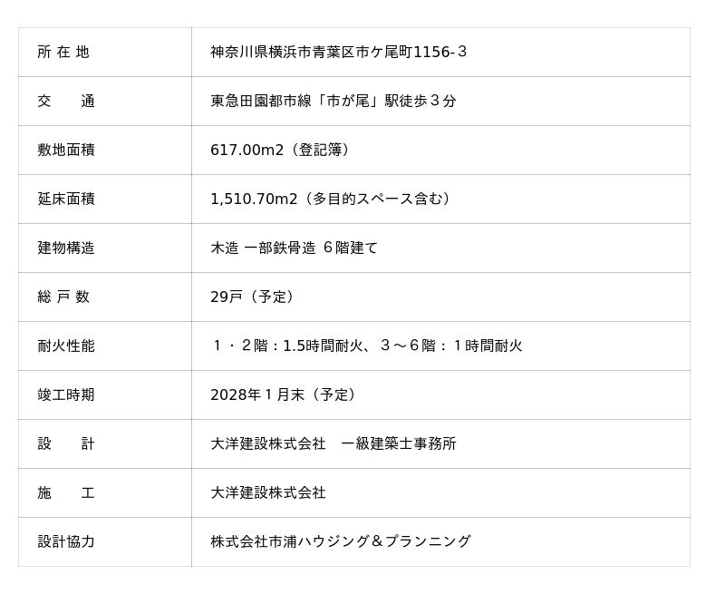 横浜市住宅供給公社(本社:横浜市神奈川区、理事長:小林一美、以下 当公社)は横浜市の中期計画および当公社中期展望で掲げる「脱炭素化」に資する取り組みを先導的モデル事業として推進するため、企業提案公募で選定した大洋建設株式会社(本社:横浜市戸塚区、代表取締役社長:黒田 憲一)と協定を締結し、省エネ性能の高い6階建て木造賃貸住宅(ZEH-M Oriented水準)を当公社が一般向け賃貸住宅として供給する「(仮称)市ケ尾マンションプロジェクト」(以下 本事業)を推進しています。