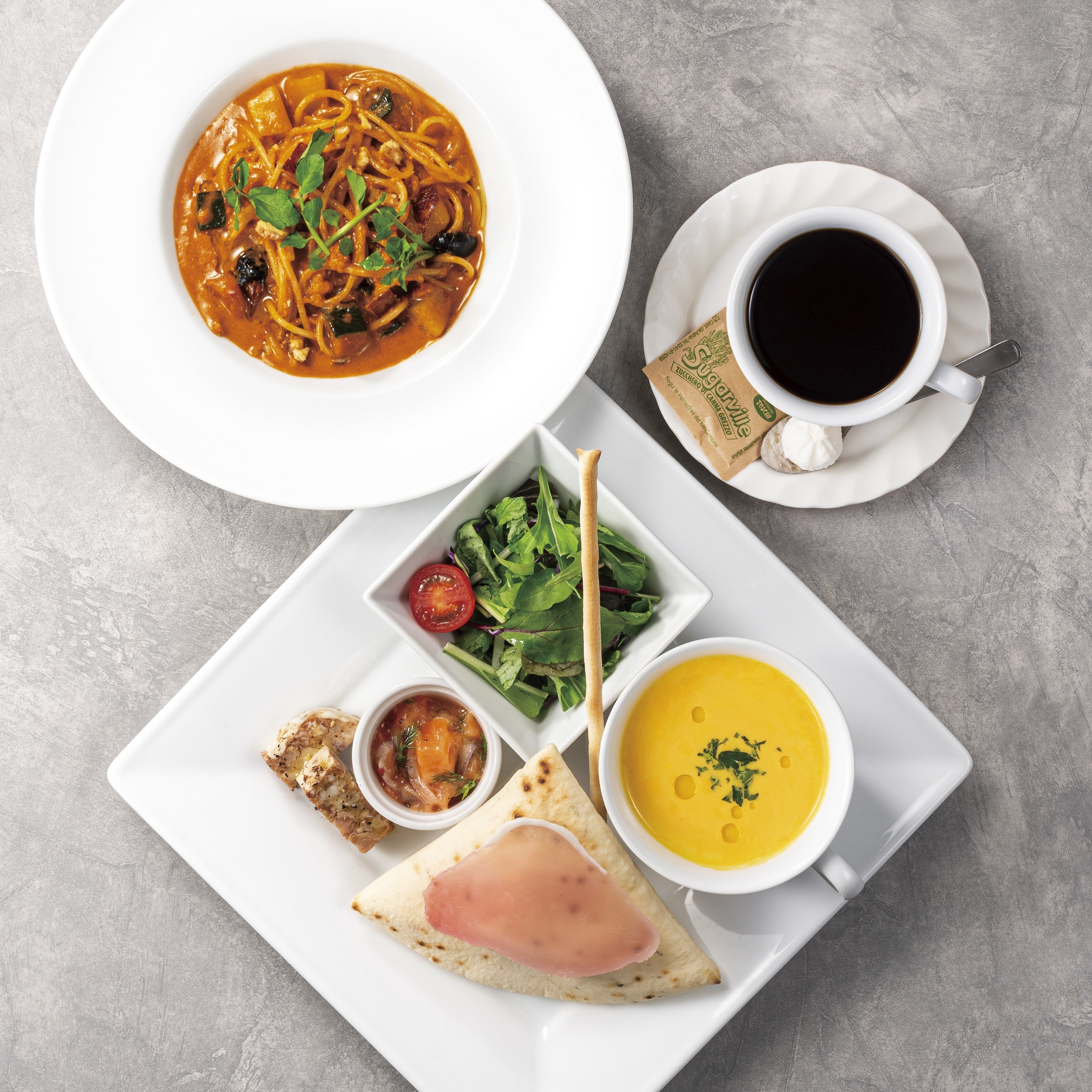 また、前菜からメインまで一度に色々楽しみたい方のために、サラダ、前菜2種、スープ、窯焼きパンを盛り付けた前菜プレートと、ハーフサイズの「オマール海老のビスクスパゲッティ」、そしてドリンクがセットになった「季節のピアットウニコ」としてもご用意しております。