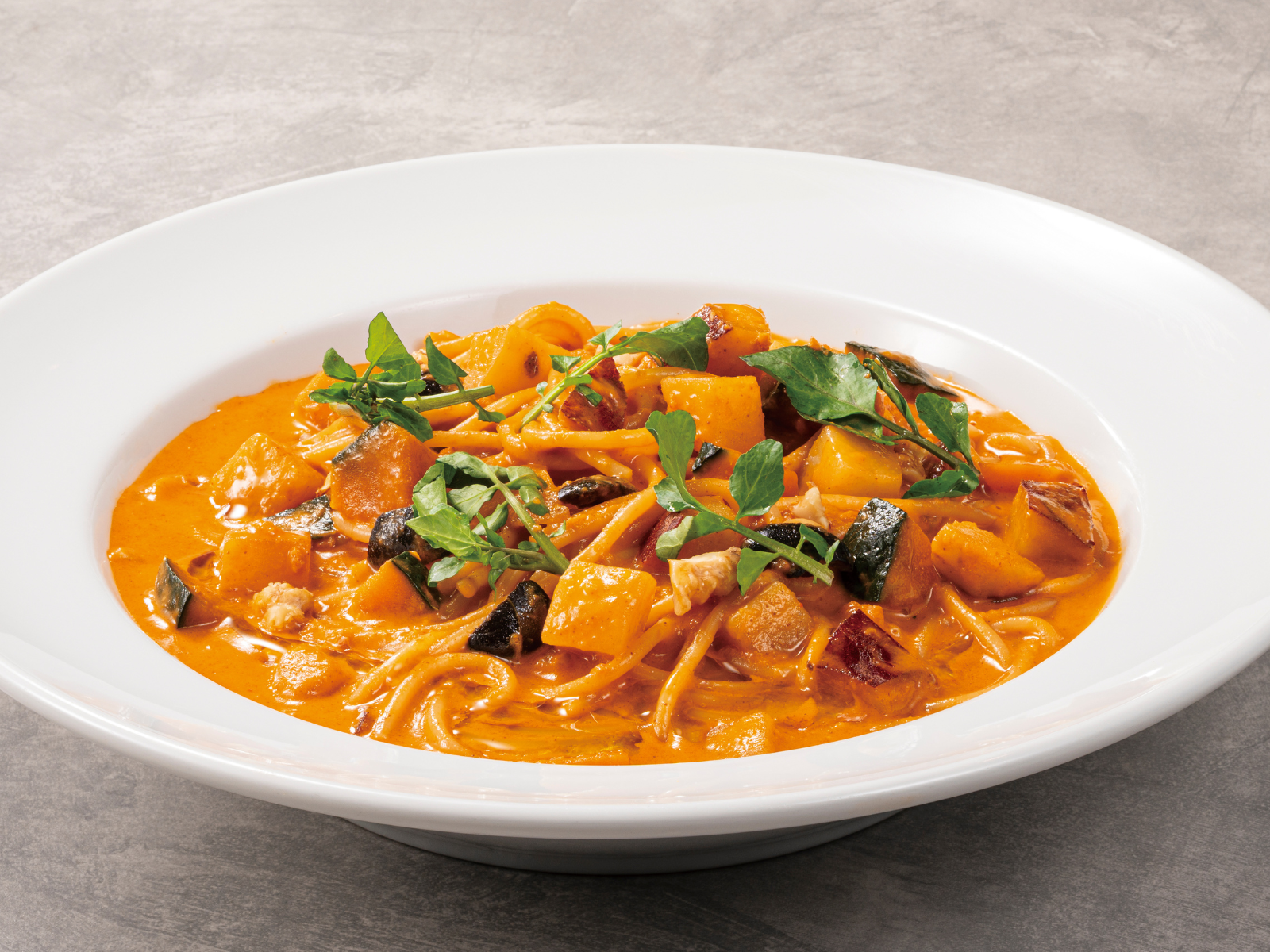 チェントペルチェントでは、季節限定メニュー「オマール海老ビスクスパゲッティ」を販売いたします。オマール海老と香味野菜の旨味が凝縮したビスクに生クリームを加え、濃厚かつなめらかなソースに仕上げました。この濃厚なビスクソースに、ほくほくとした食感の南瓜、さつまいも、じゃがいもといった季節の野菜を合わせています。オマール海老のコクと野菜の持つ自然な甘味が溶け合った、優しいビスクをお楽しみいただけます。