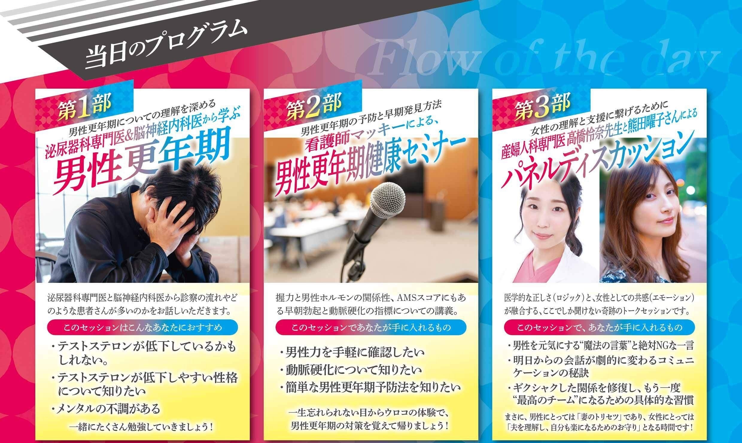 開催への想い:「医療現場で多くの男性が自分の健康を後回しにする姿を見てきました。男性が弱音を吐きにくい社会で、性の健康や更年期の悩みは特に深刻です。このイベントが、男性自身、そしてパートナーが共に健康についてオープンに話し合い、より豊かな人生を送るための一歩となることを願っています。」