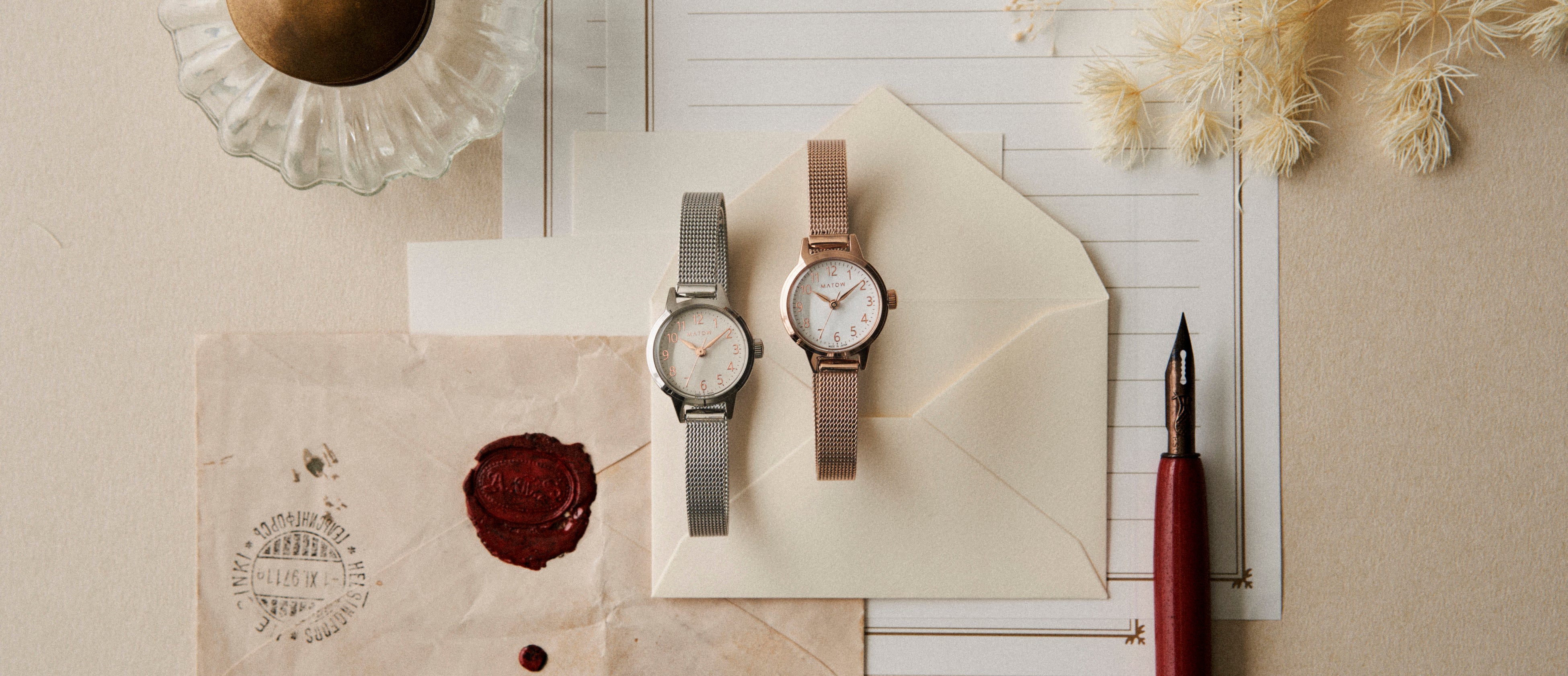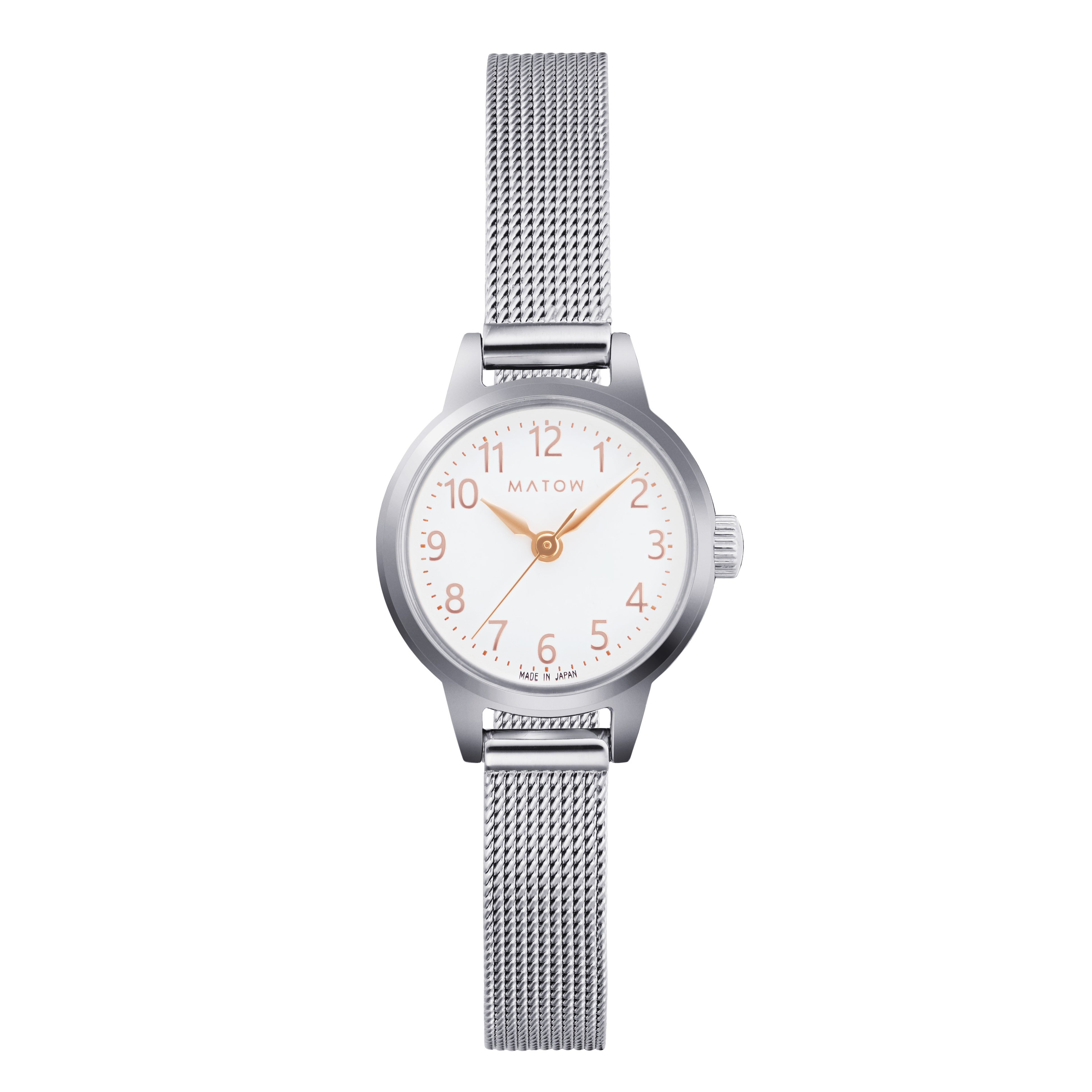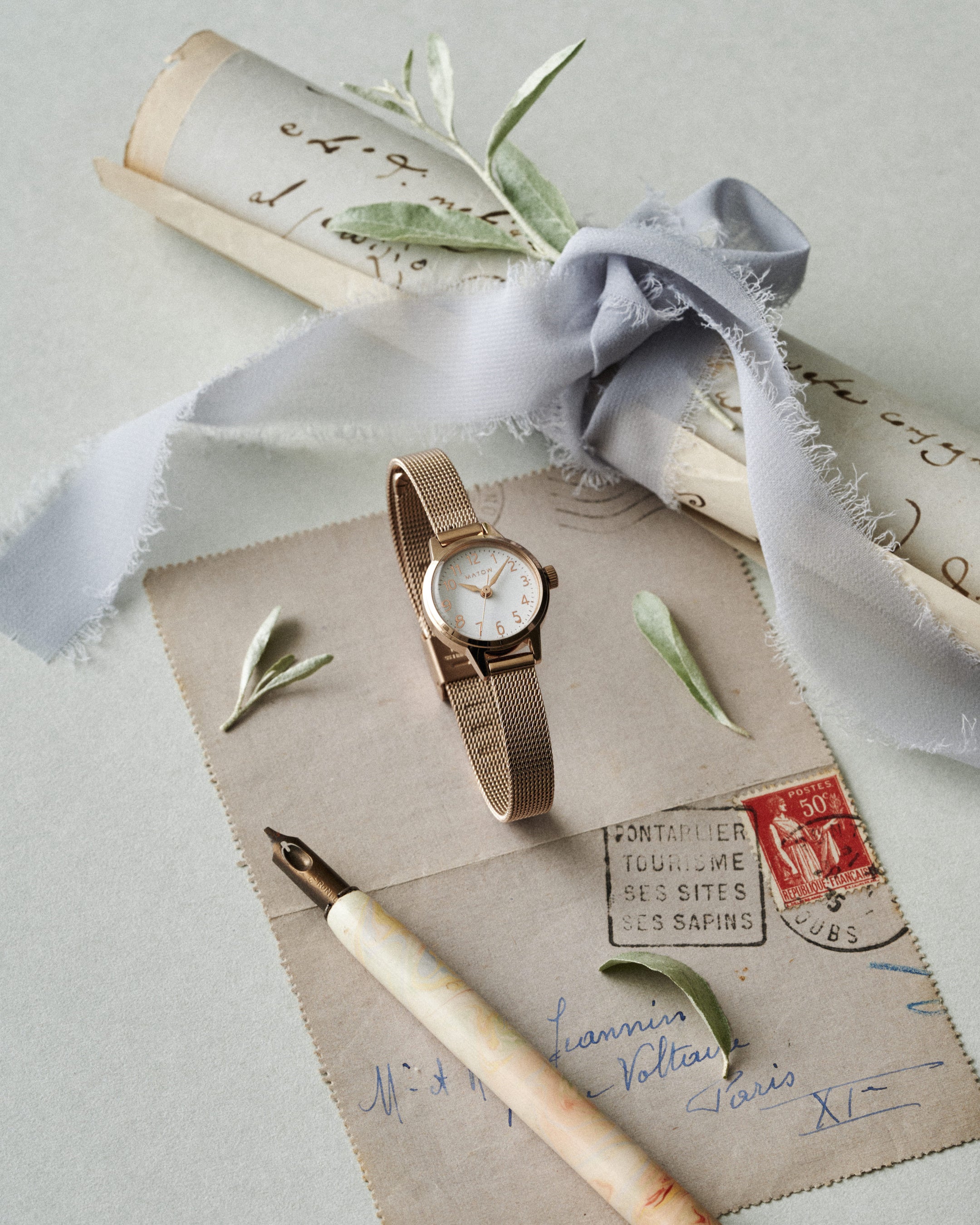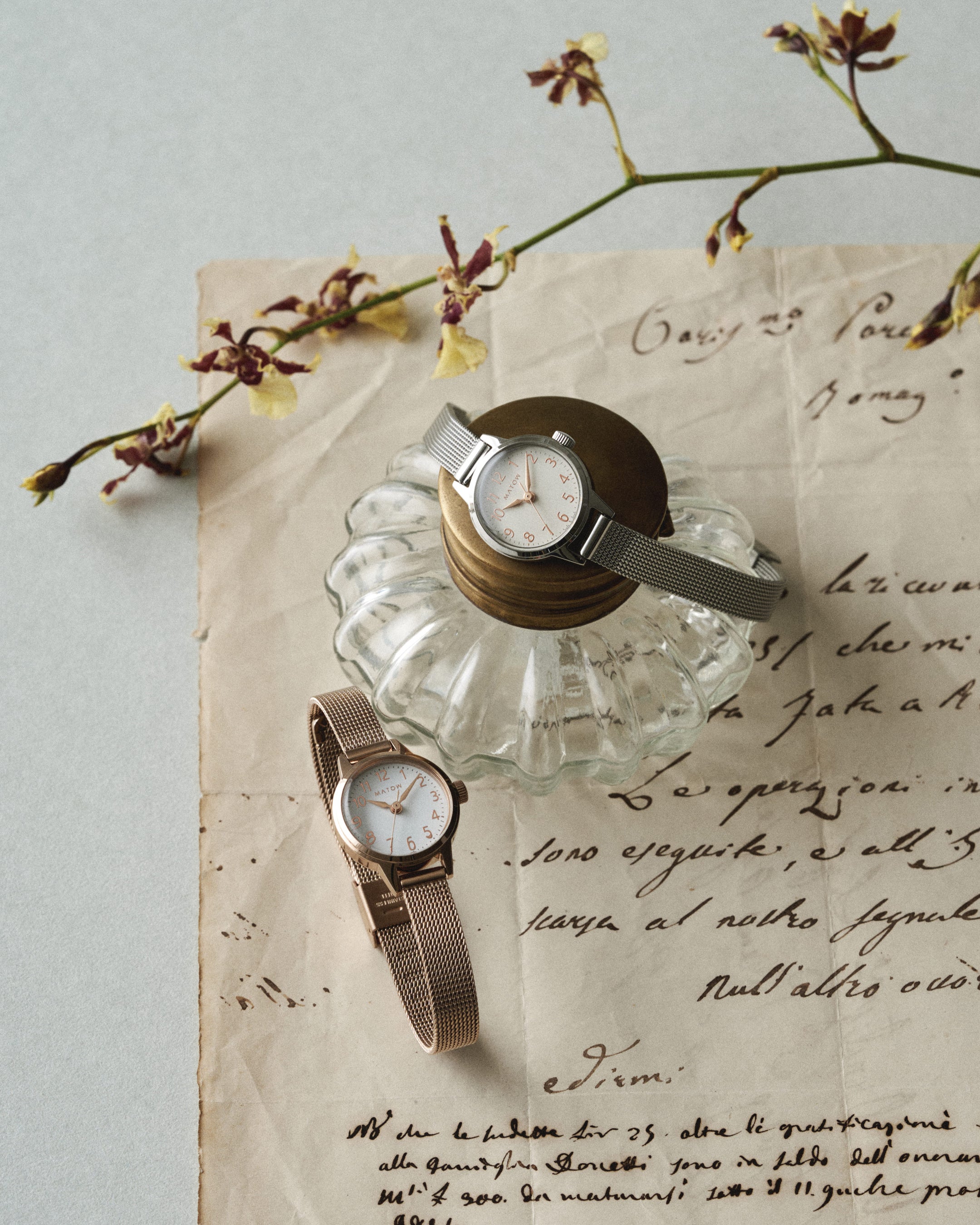 アラビア数字のインデックスは一目で時刻を読み取れる視認性を備え、日常に寄り添う実用性を実現。さらにドーム型のミネラルガラスが柔らかな陰影を生み、温もりを感じさせる表情を与えます。今回新たに加わったメッシュバンドは、月光のきらめきを繊細に編み込んだかのような輝きをまとい、シルバーとローズゴールドの2カラーで展開。ステンレススチール製のしなやかなメッシュは軽やかで肌に馴染みやすく、ジュエリー感覚で腕元を飾ります。