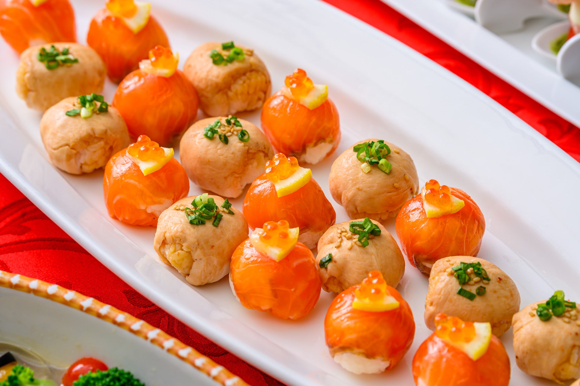 冷製料理は魚介と野菜を中心に、温製料理は肉料理をメインに構成しました。気軽にお召し上がりいただけるフィンガーフードから本格的なメインディッシュまで、どの世代の方にもご満足いただけるラインナップ。かわいらしい「手毬寿司」、見た目も華やかな「海の幸パエリア」や「季節魚のアクアパッツァ」、クリスマスリースをイメージした「クリスマスリースピザ」など、料理を囲むだけで自然と笑顔と会話が弾む、そんなひとときを演出します。