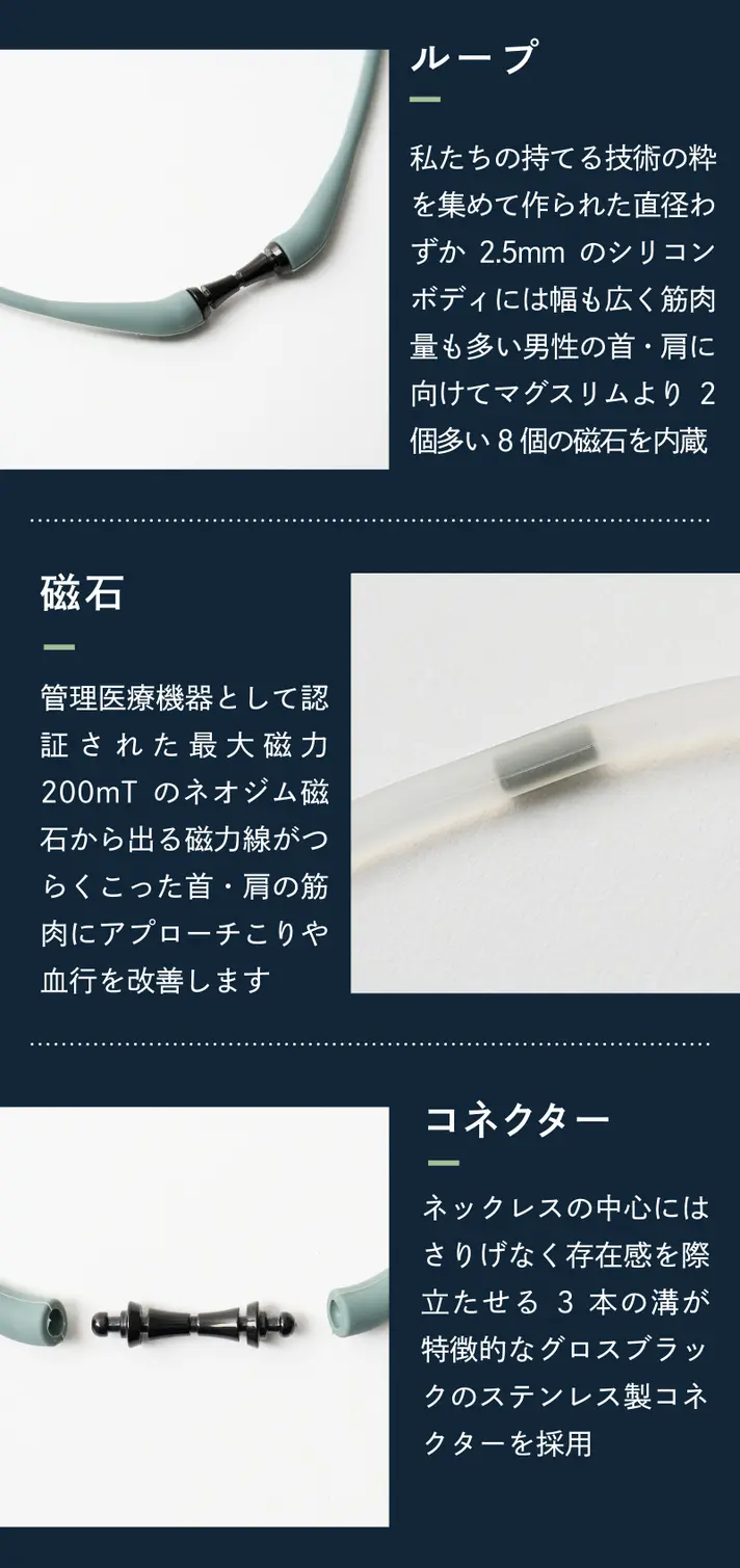 メンズラインは従来モデルより長さを約7cm長く設計し、磁石を2個増量しながらも、わずか6gの軽量設計。“着けていることを忘れる”ほどの軽やかさで、一日中快適に着用できます。