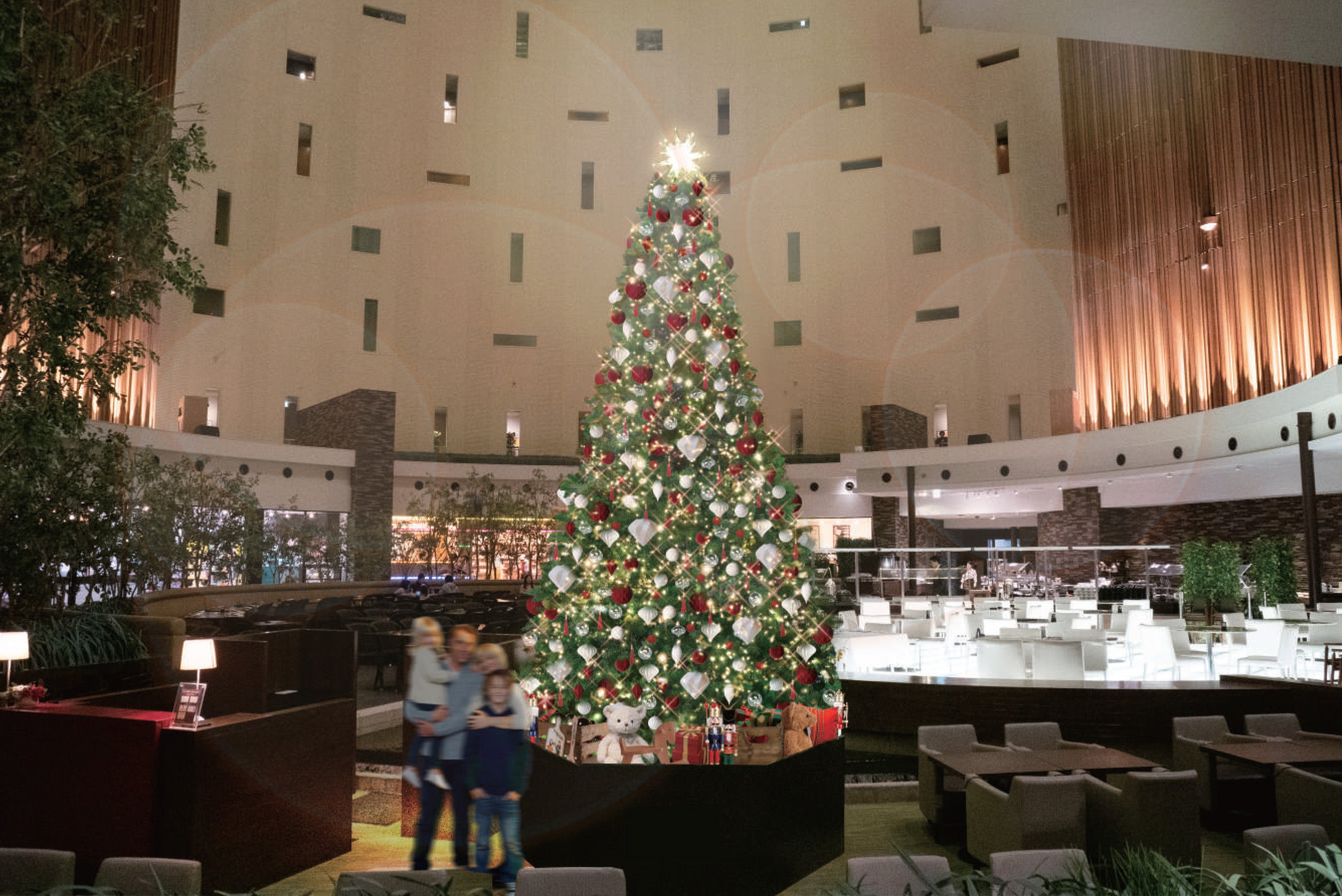 赤と白で彩られたクラシックなクリスマスツリーがロビーを華やかに包みます。高さ約6mの大きなツリーの足元には、サンタクロースから届いたプレゼントボックスやテディベア、くるみ割り人形などが並び、心温まるクリスマスの世界へと誘います。正面玄関からロビーまで、赤と白の装飾が連なり、館内をあたたかな雰囲気で包み込みます。