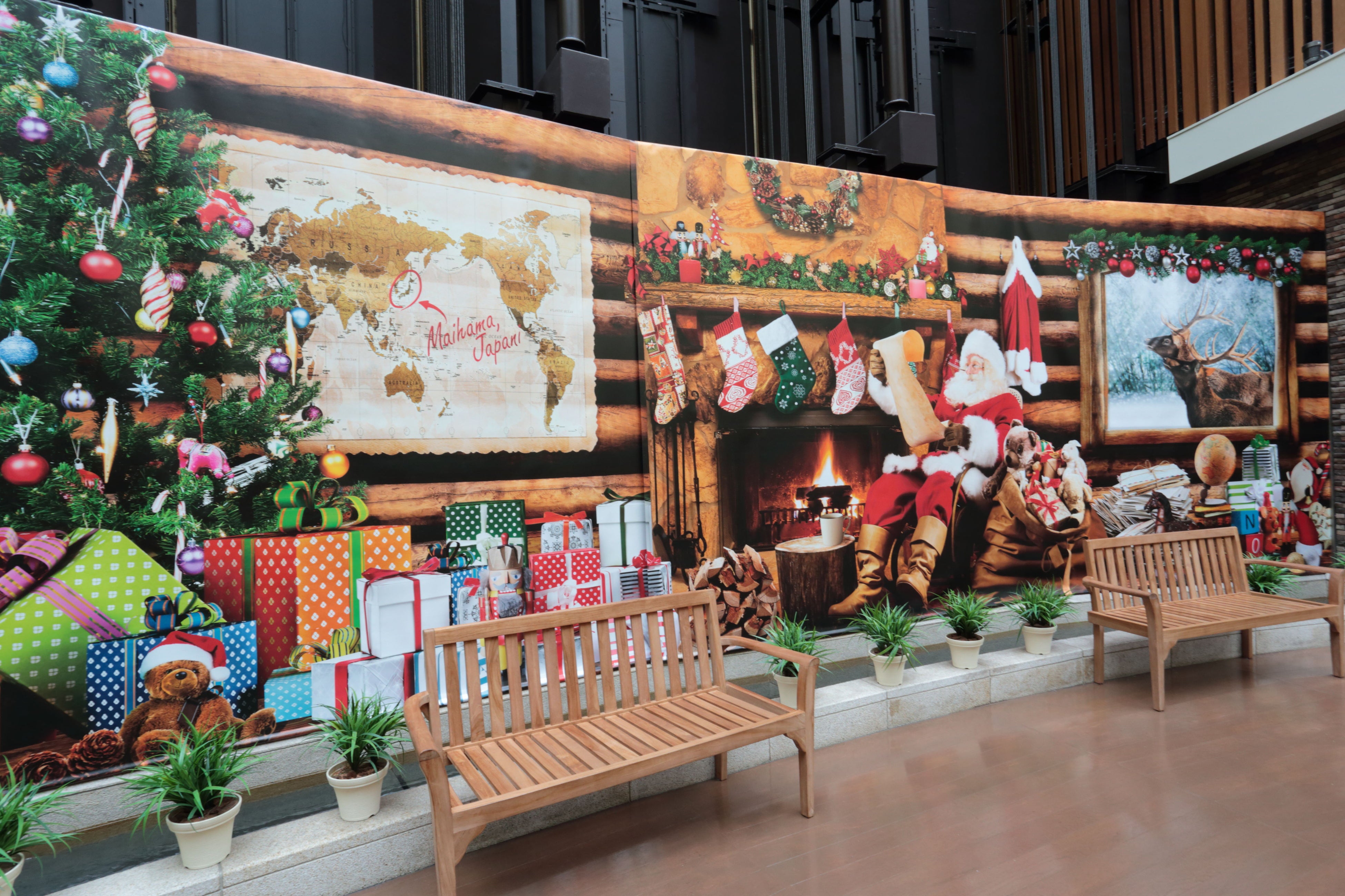 季節ごとに表情を変える巨大フォトスポットもクリスマス仕様に。子どもたちからの手紙を読みながらプレゼントの準備をしているサンタクロースが描かれています。よく見ると世界地図には”Maihama”の文字が…。サンタクロースのアトリエで過ごすような、心ときめくクリスマスの一枚をぜひ。