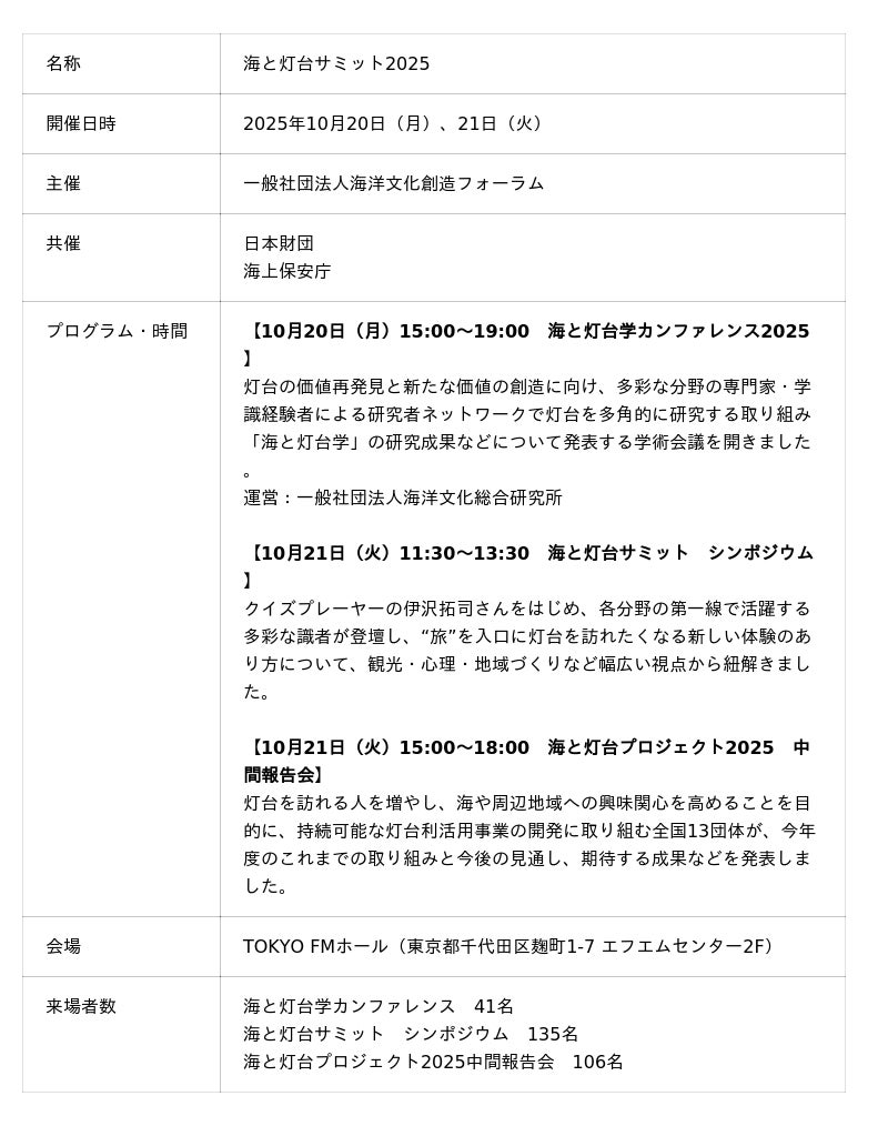 日本財団「海と灯台プロジェクト」を運営する一般社団法人 海洋文化創造フォーラムは、2025年10月20日(月)と21日(火)の2日間、TOKYO FMホール(東京都千代田区)にて「海と灯台サミット2025」を開催しました。
