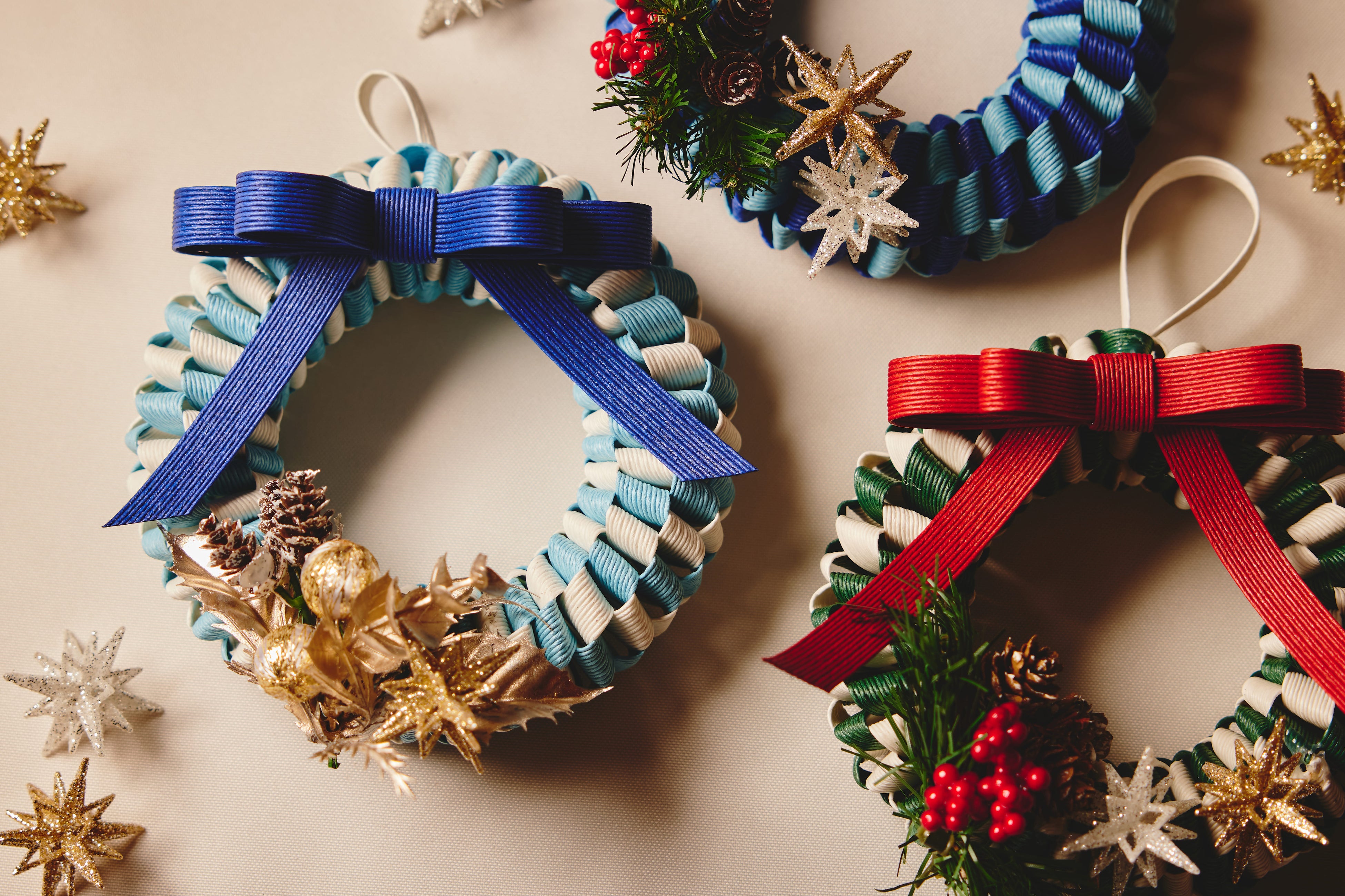 花火玉で使用されるクラフト紙2色を編み込んで作る、オリジナルリース作りを開催します。リボンや柊、花火の煌めきをイメージしたオーナメントなどを好みに合わせて選ぶ、子どもから大人まで楽しめる体験です。完成したクリスマスリースを持ち帰って飾ることで、リゾナーレ熱海で過ごしたクリスマスを思い出すことができます。