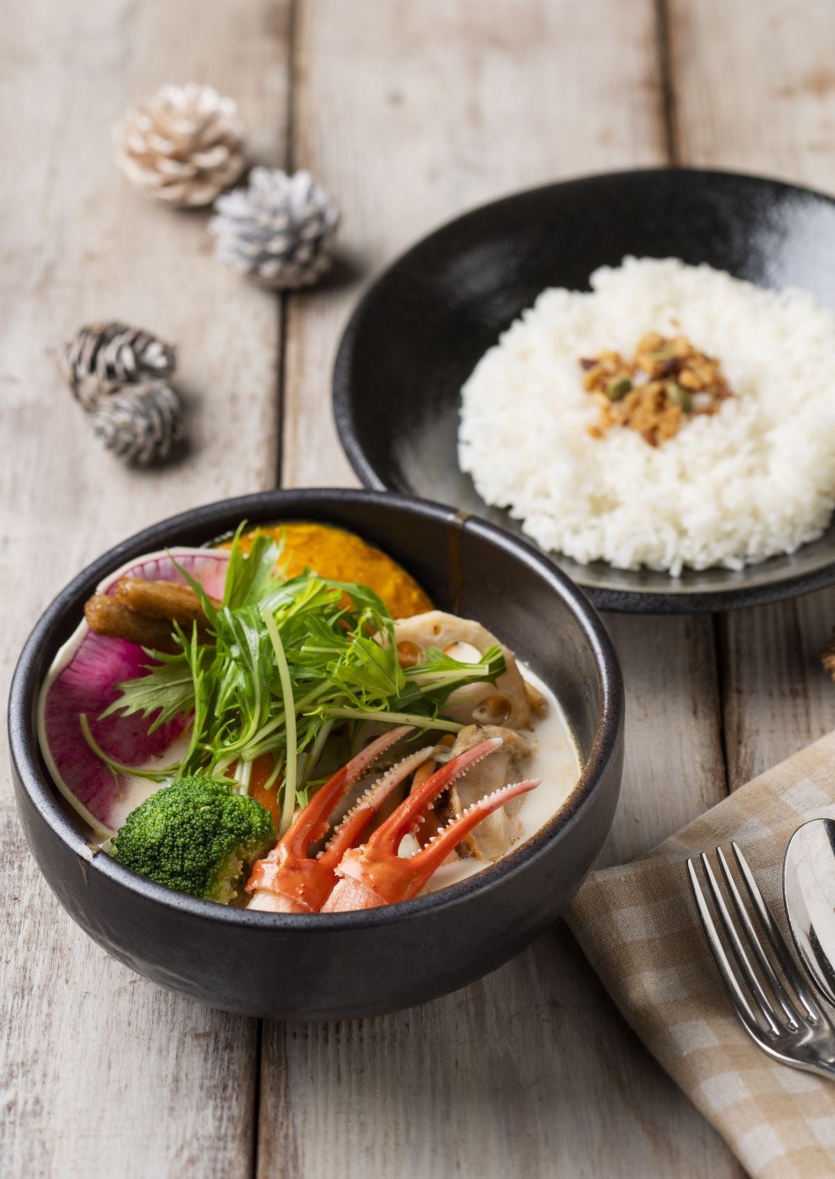 【白いスープカレー ~紅ズワイガニと猿払産ホタテ~】1,850円(税込)人気メニュー「白いスープカレー」の具材を、期間限定でアレンジ。カニとホタテが入った特別仕様に!ライスの上のナッツがアクセント。